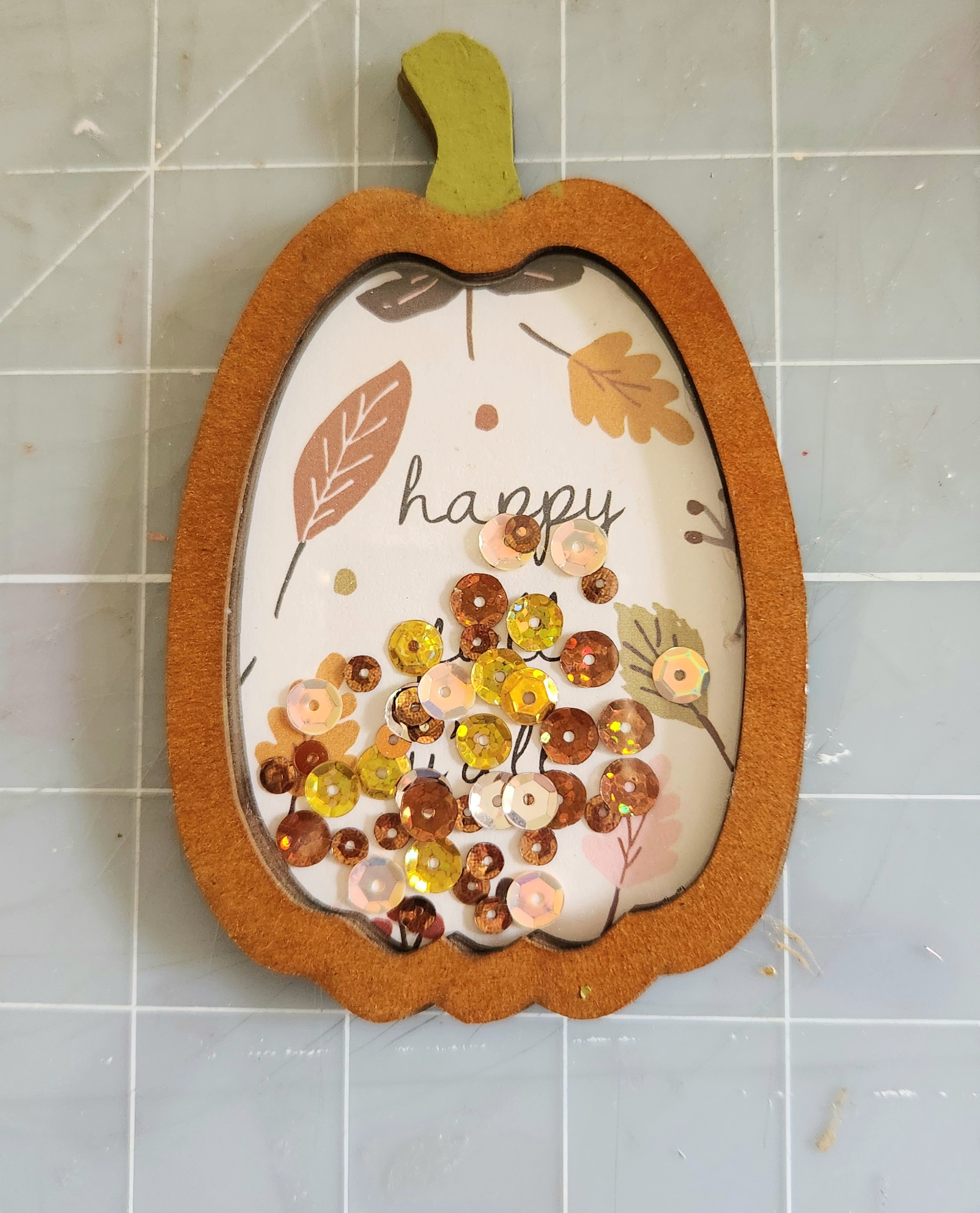 Now glue your first 2 chipboard shaker pieces on top of your Pumpkin shaker bottom base. I recommend using Beacon glue. Its strong and your shaker will stay secured. I filled my shaker with fall colored sequins. But you can use confetti, beads, whatever you desire. Take your acrylic shaker piece and peel off the protective film from both sides before gluing in place. Then add your top shaker piece. Set aside to dry throughly before shaking! Here's some photos: