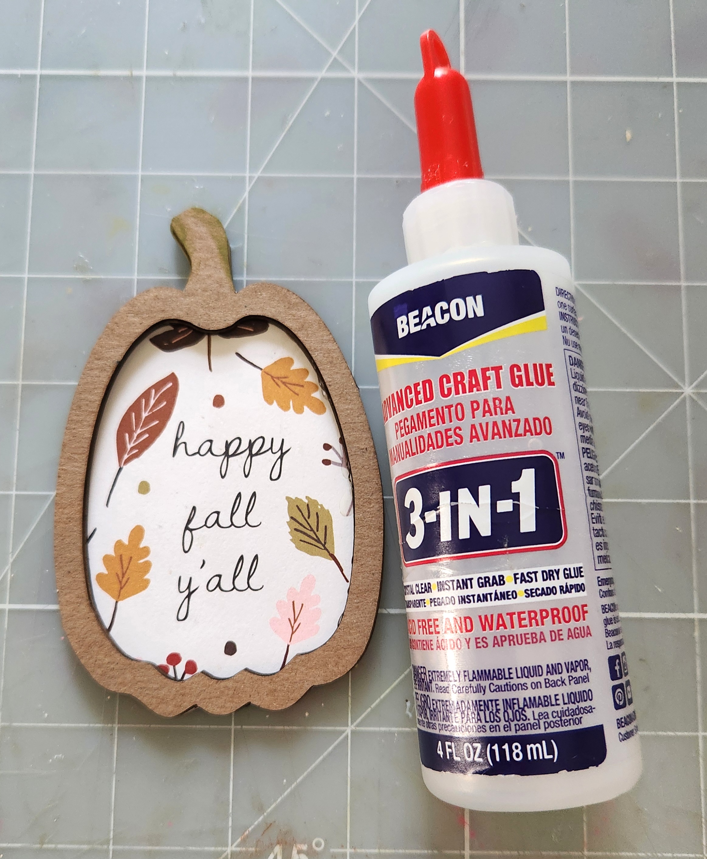 Once your shaker has dried you can glue along the bottom along with both of the gnomes hands on each side. I applied a ephemera sentiment at the top of my shaker Pumpkin. Here's a closeup!