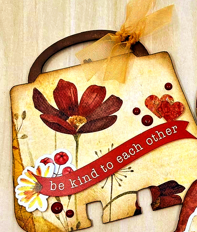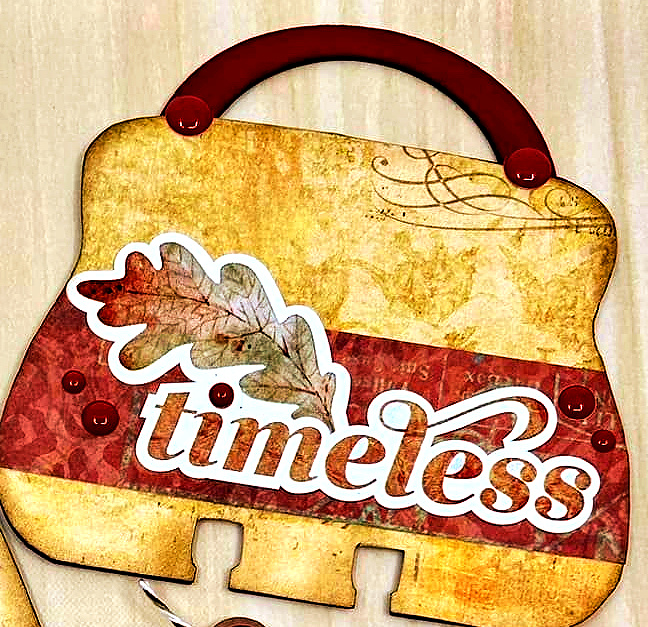 Little details like the curve to the edges, or the cute handle make these a great choice! The handle was painted with red acrylic paint. After it dried, this shape was traced onto a pretty patterned paper and then cut out and glued to the chipboard shape. Distress ink was brushed around the edges of the shape. After that, I've just added a few stickers, paper scraps and enamel dots. This would be a great set of Memory-Dex cards to use for a girls trip, or for your favorite "fashionista". It would also be great for any fall memories as well.