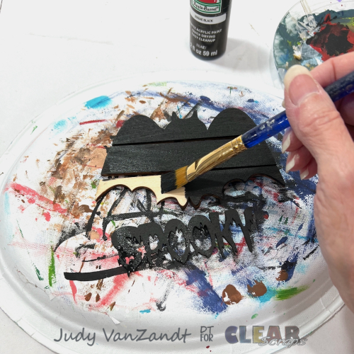 The first thing I did is paint the bat and the “spooky” word with black acrylic paint.