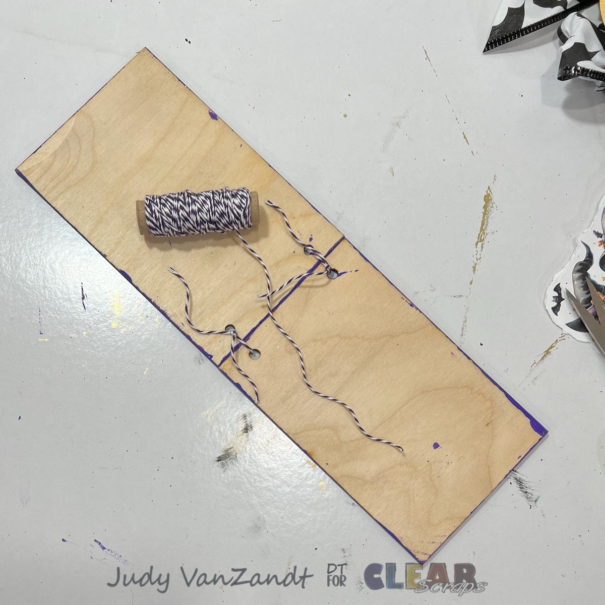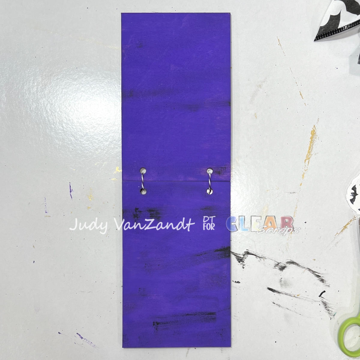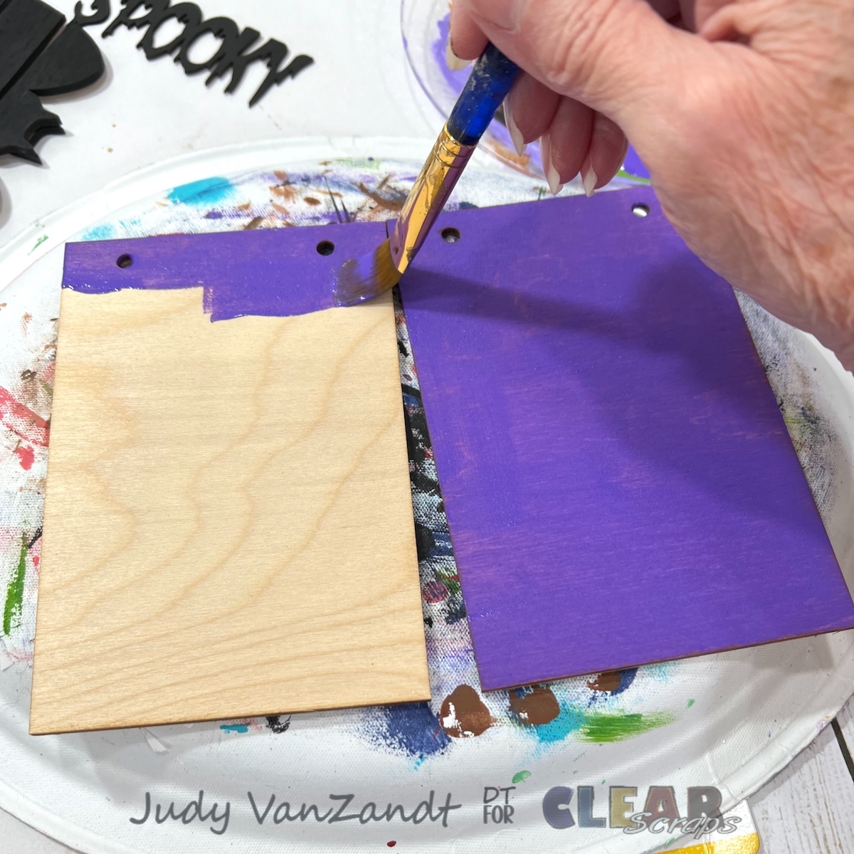 Next I painted both wood cards with purple acrylic paint. I did 2 coats. Then did a small amount of dry brushing with black paint.