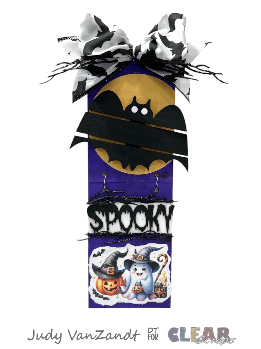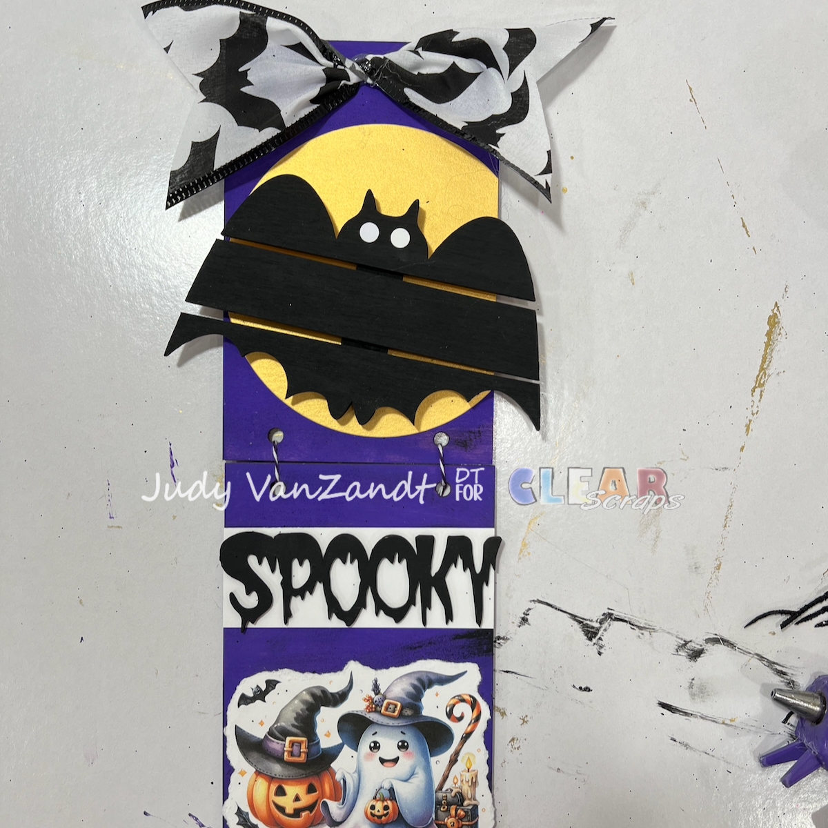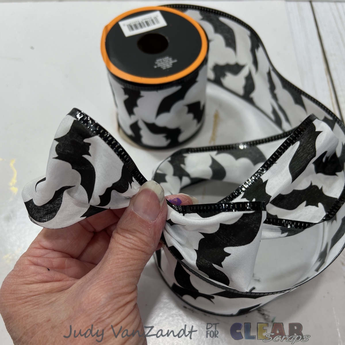 Fashion tails for a bow by twisting a piece of ribbon and adhere to the top of the base. Add the bat and “spooky” word title.