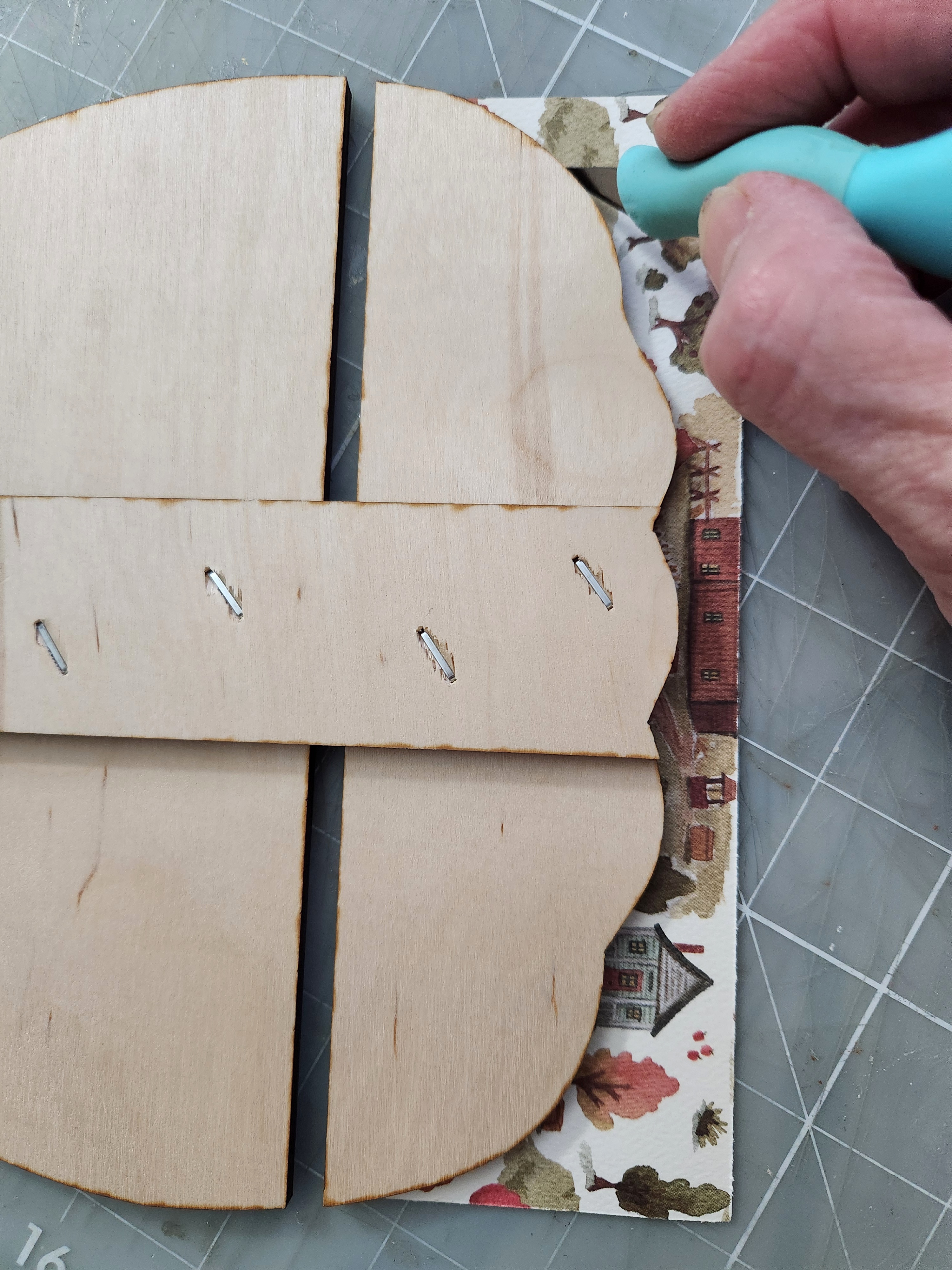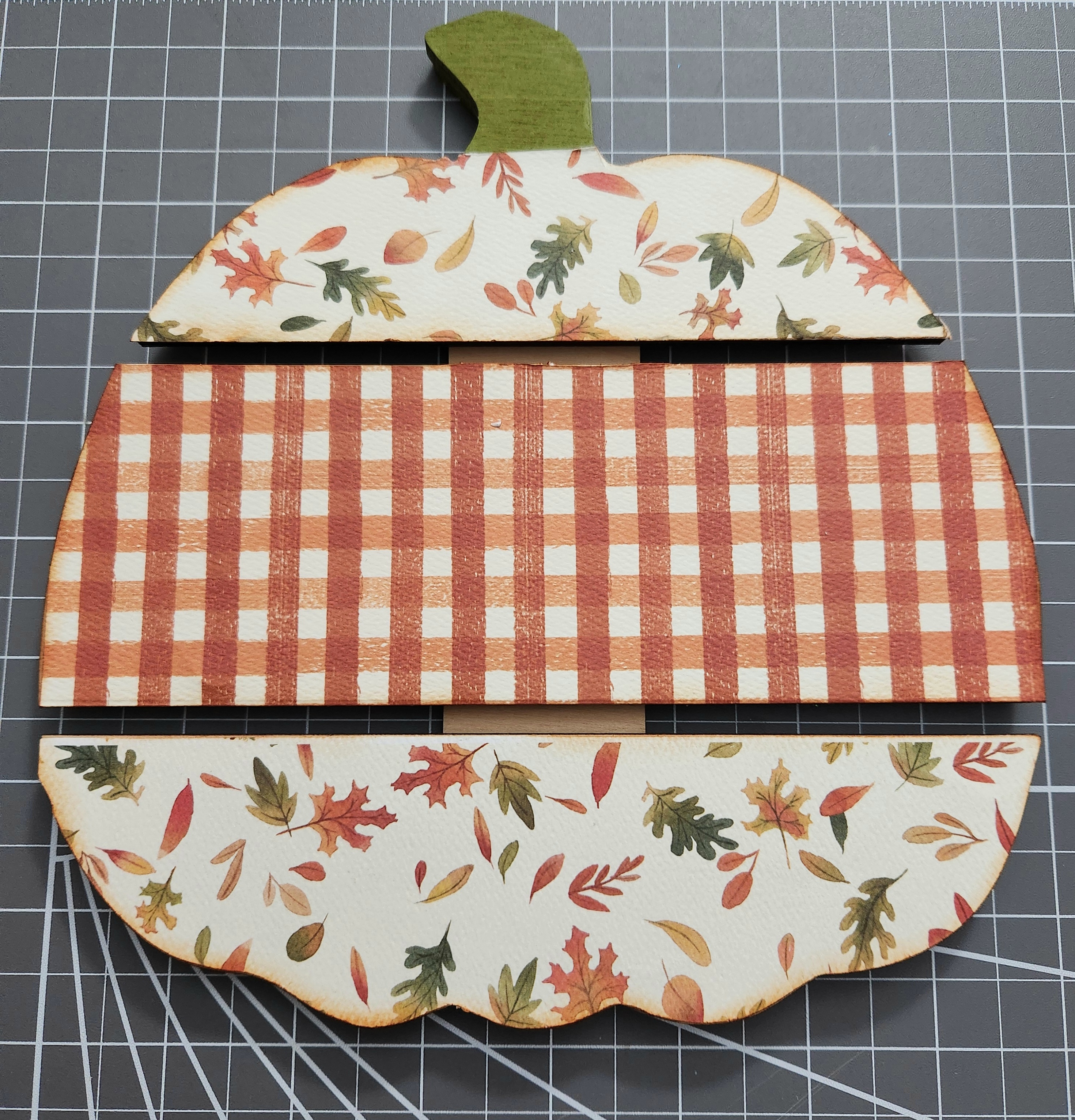 Next chose acouple patterned papers and cut and glue to each pallet section on your wood pumpkin. Taking my xaco knife I trimmed away any excess paper, see photo: