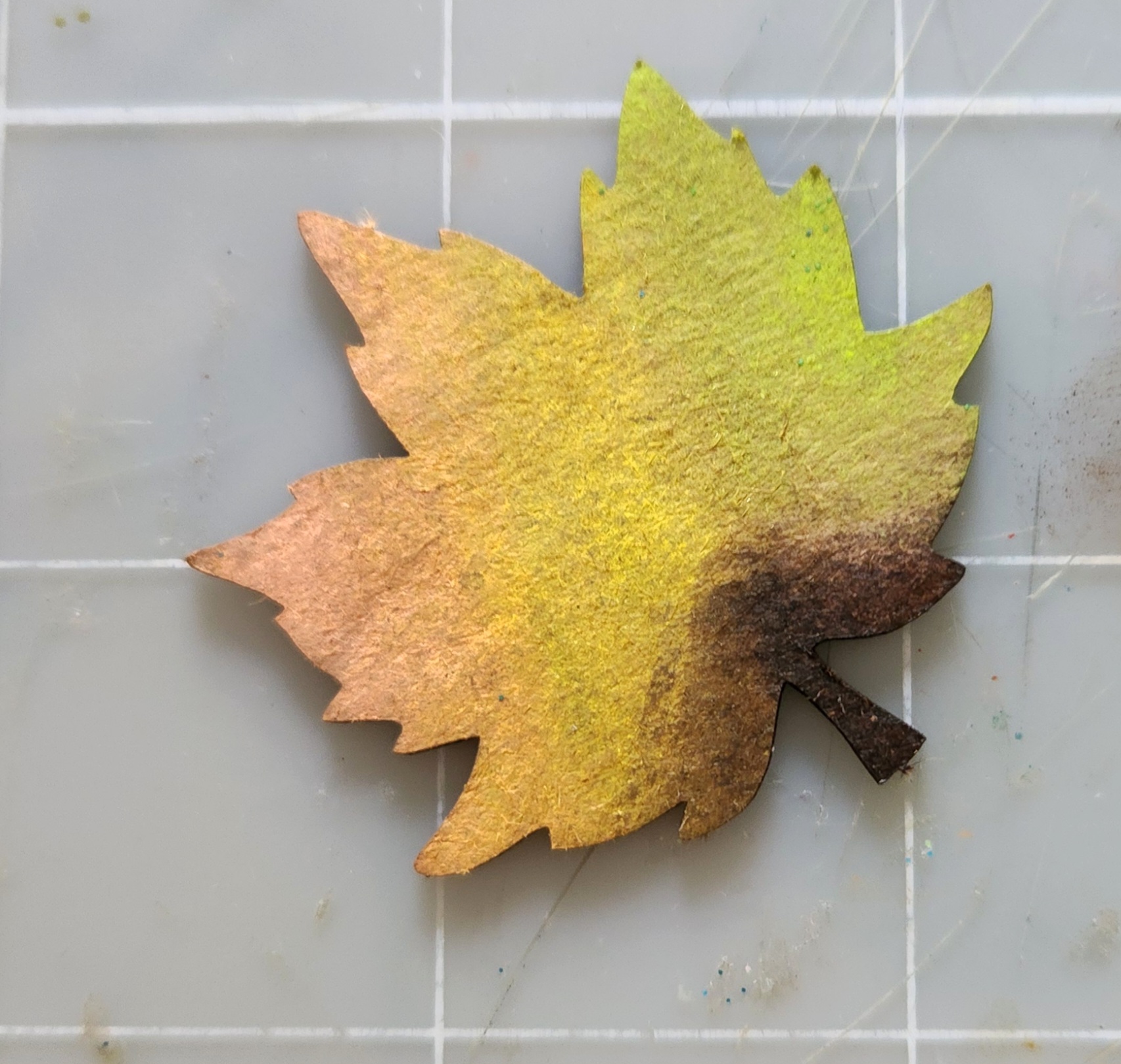 On the Chipboard leaf, I applied Orange, brown, yellow and green Inks and blended slightly using my finger. See photo: