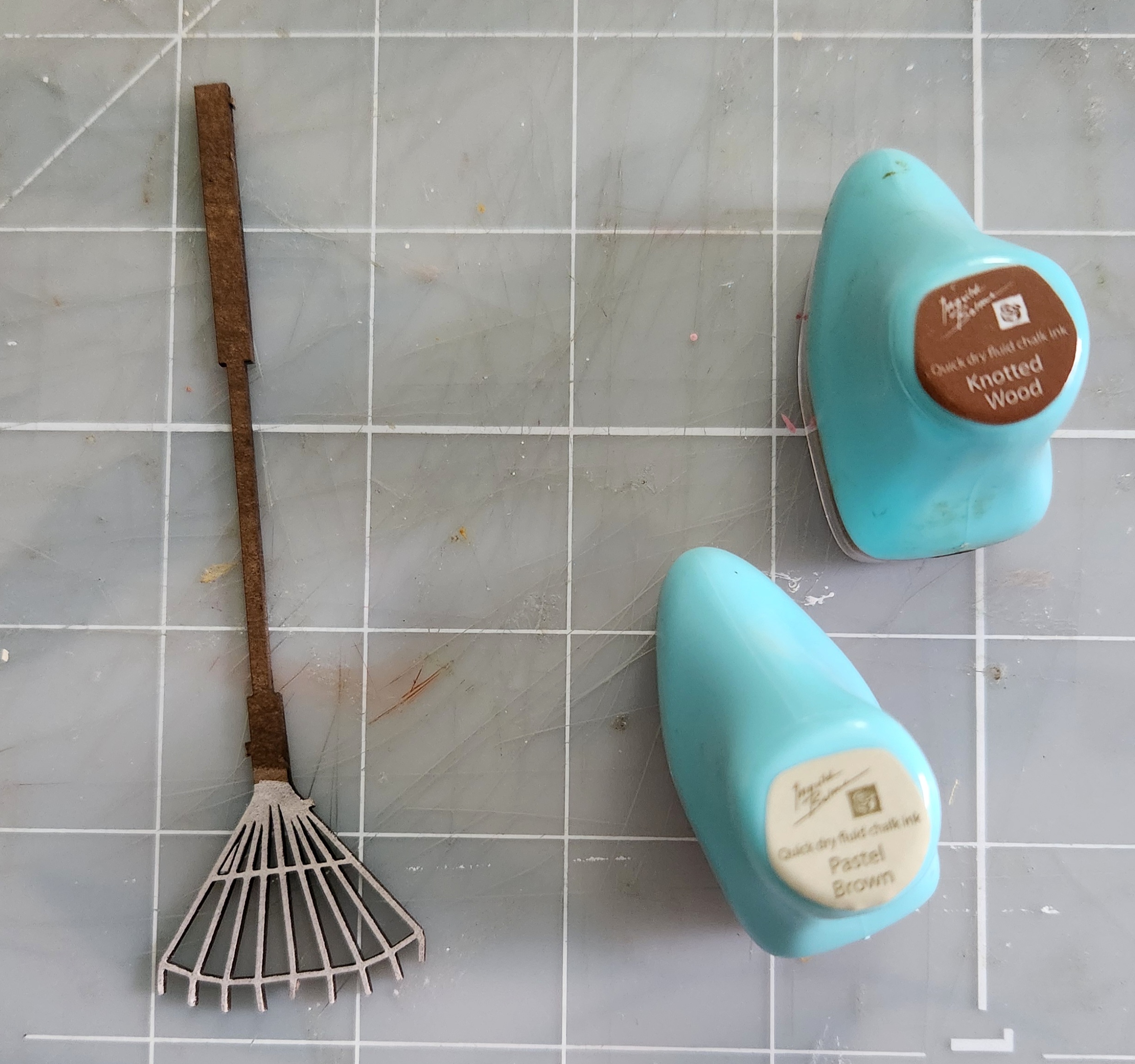 I applied some Prima Chalk Ink in Knotted Wood on the handle and Pastel Brown on the bottom rake. Let dry.