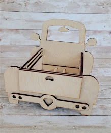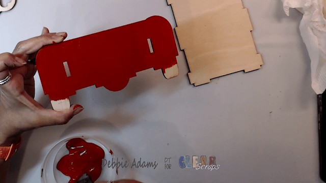 After I finished painting the front and back of each piece and they're all dried I placed the front of the truck down and placed the side into the slots of the truck. Place glue on each of the wooden tabs and insert them into the slots.