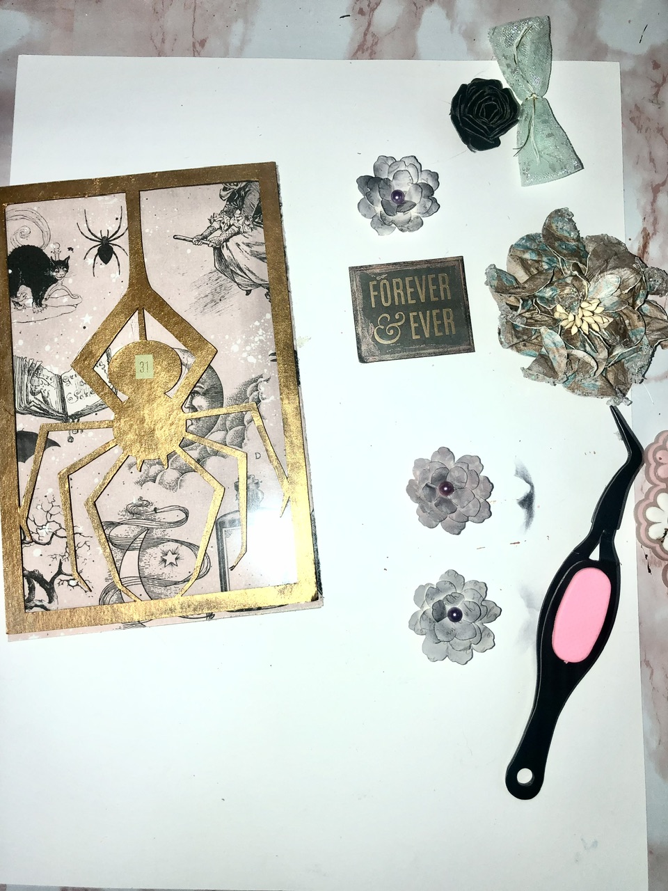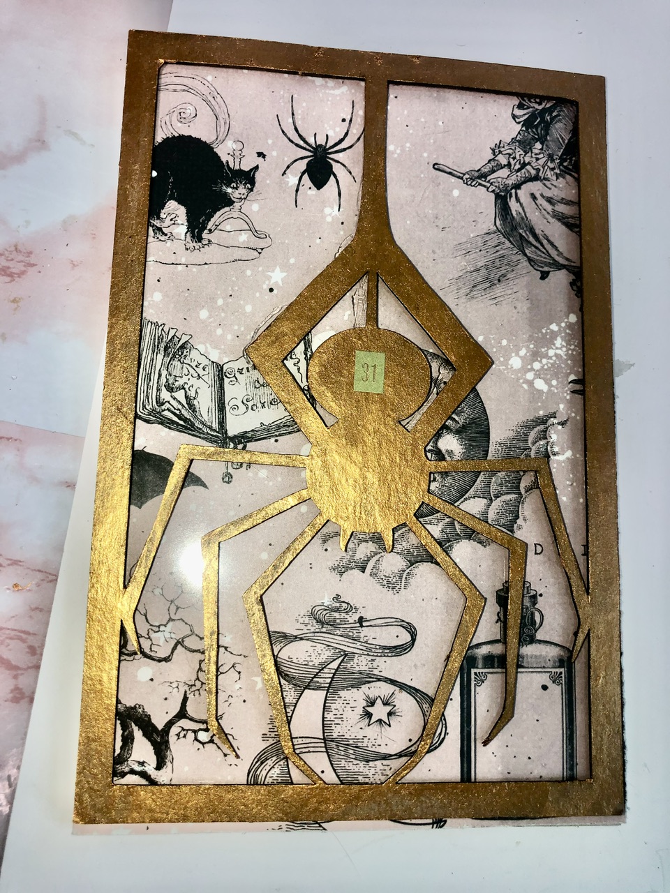 I’ve used gold paint to cover the chipboard _Spider_Embellishment.