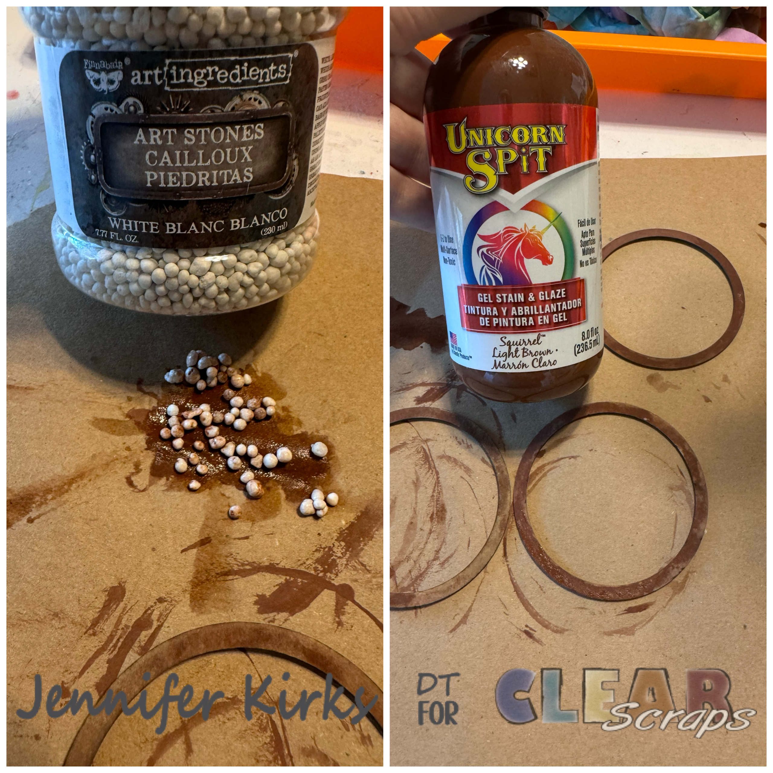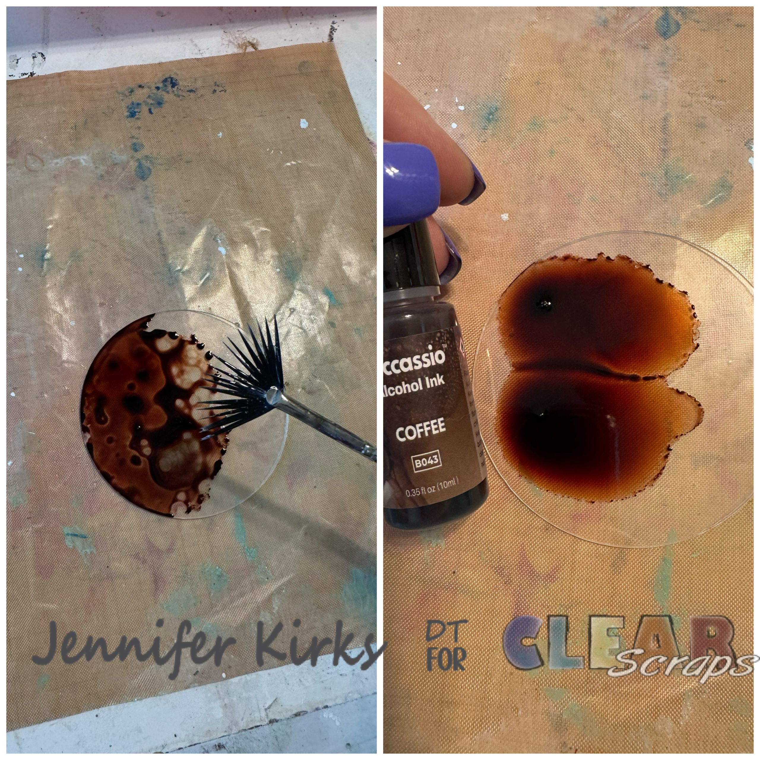 I began by staining the shaker rings and some art stones with a deep brown Unicorn Spit. While that gorgeous hue dried, I gently peeled off one side of the protective film from the acrylic piece, ensuring the other side remained to protect it. Then, I applied some brown alcohol ink and used a splatter brush to create a captivating watery effect that truly brought the piece to life!