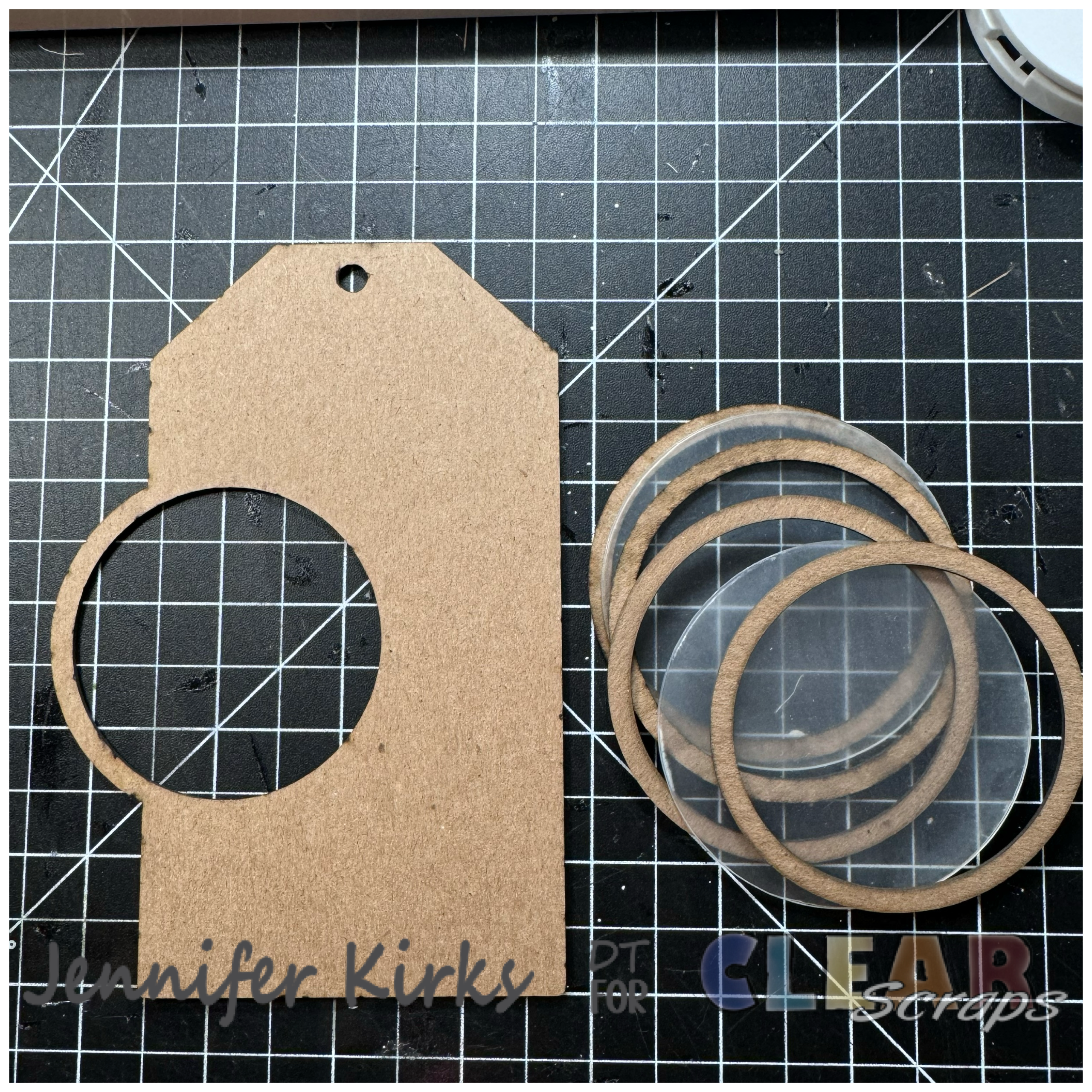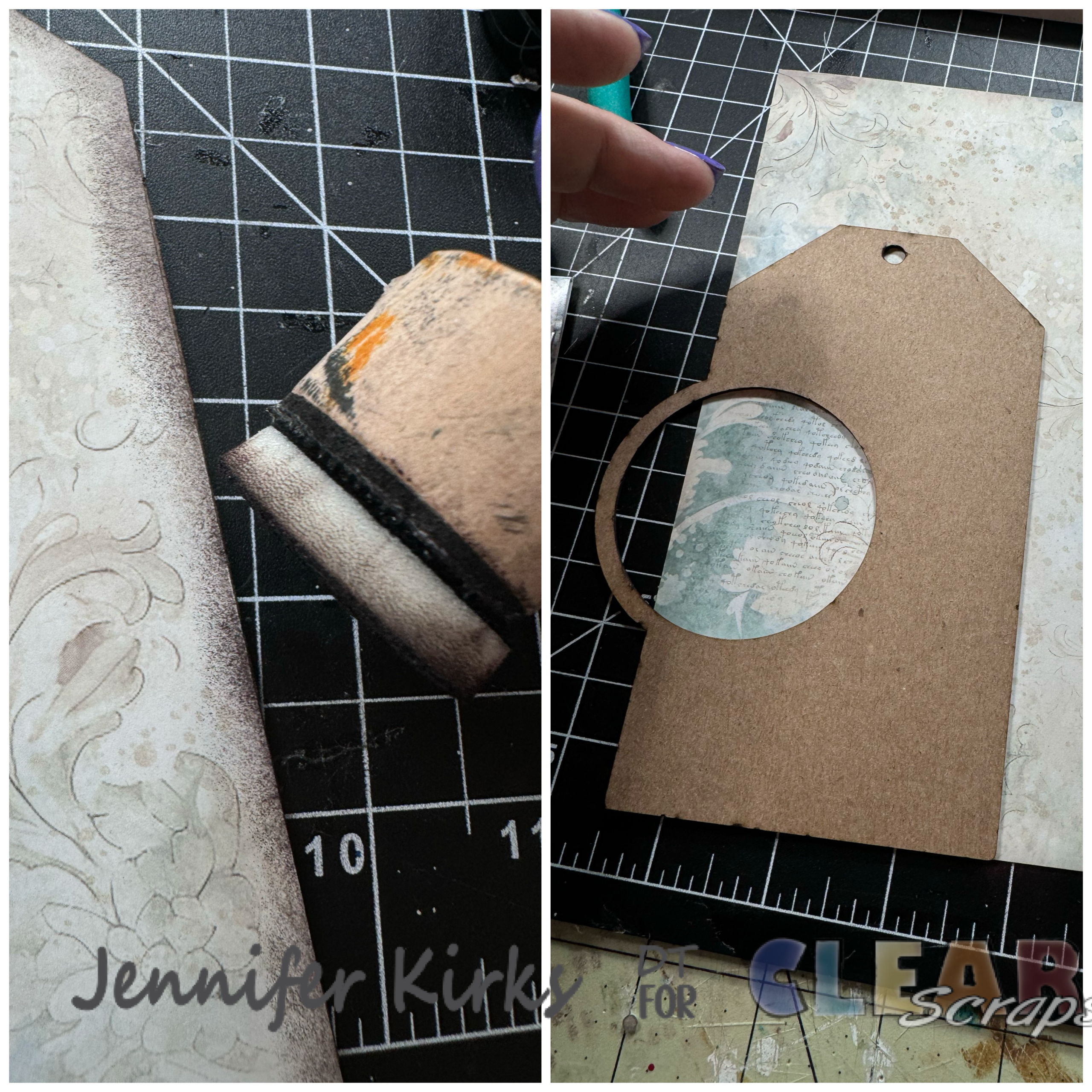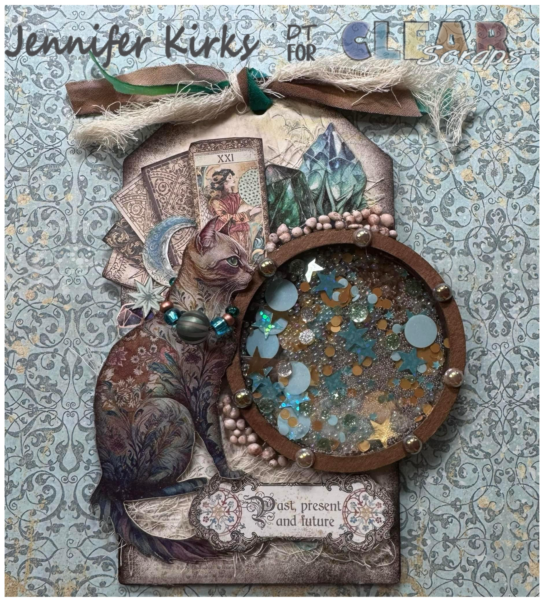 I carefully covered both sides of the tag with the paper I had meticulously traced and cut out, inking the edges with a rich, dark brown to give it a touch of depth. Next, I assembled the shaker portion, filling it with a delightful array of die cuts from the collection. To add an artistic flair, I sprinkled art stones around the circle, creating a textured, enchanting effect. To finish it off, I adorned the outer edge of the shaker with vibrant colored cabochons, adding a pop of color and whimsy.