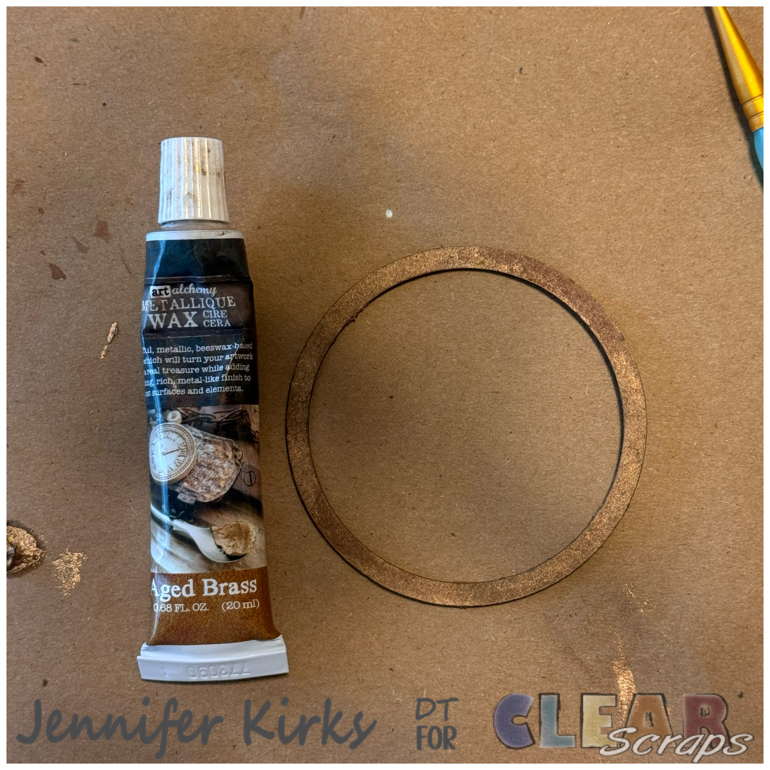 While the alcohol ink dried, I applied some aged brass metallique wax to the top and back side ring of the shaker. This added a beautiful touch that seamlessly blended with the gold tones in the paper collection!