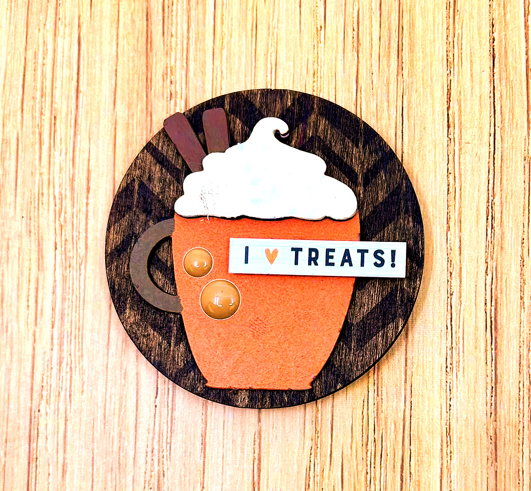 To decorate this chevron/fall lid, the NEW Clear Scraps Embellishment Chipboard Punchout sheet had the adorable coffee mug in the wintery set.