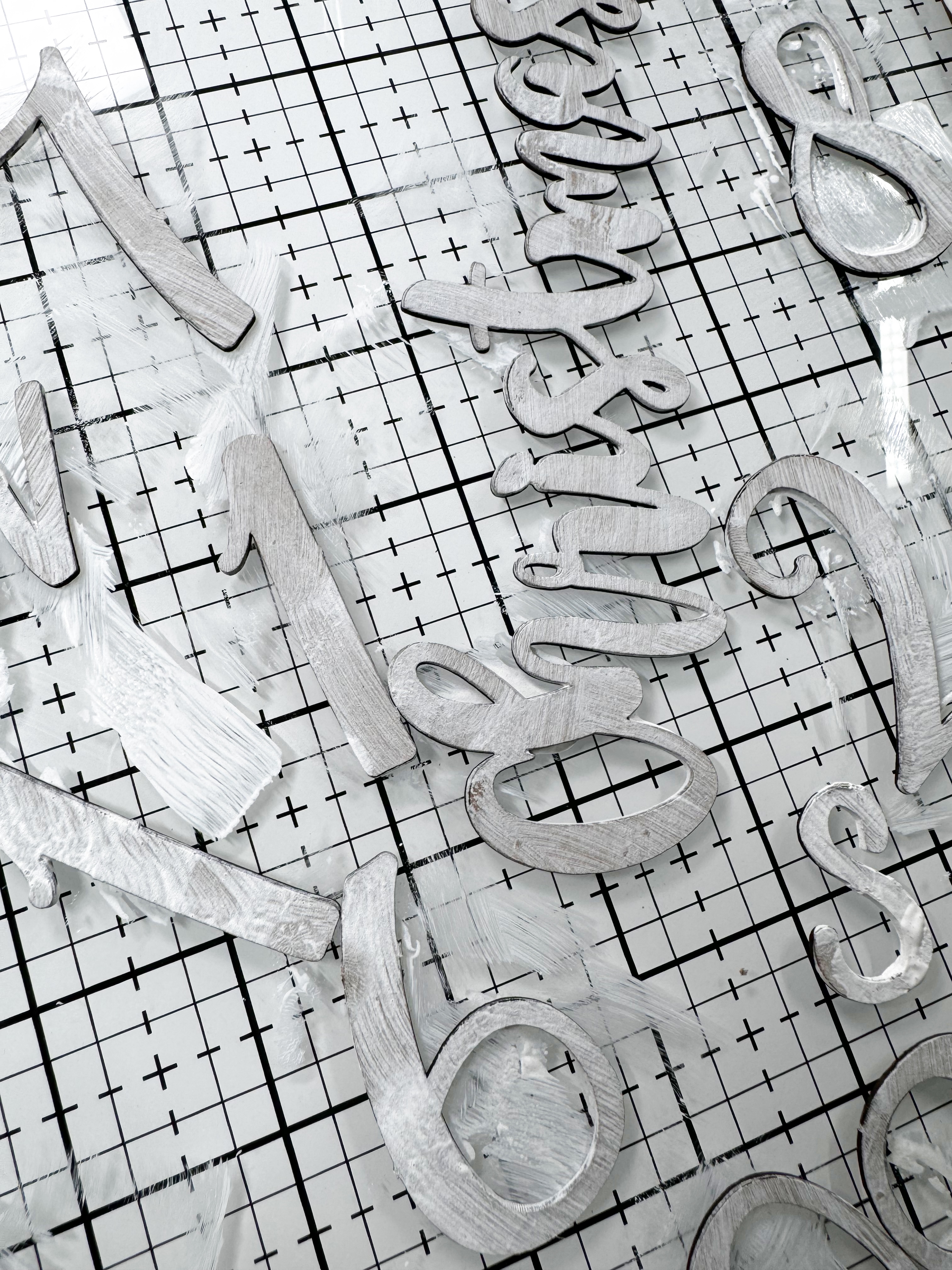 I used some scissors to cut apart the letters and numbers. There are tiny chads that make this easy to do. Next, I began covering each of the pieces with some white gesso. Using white gesso on the chipboard will allow any paint I apply to sit on top of the chipboard. I think it gives a richer color when painted by doing this step. You definitely don't have to do this step.