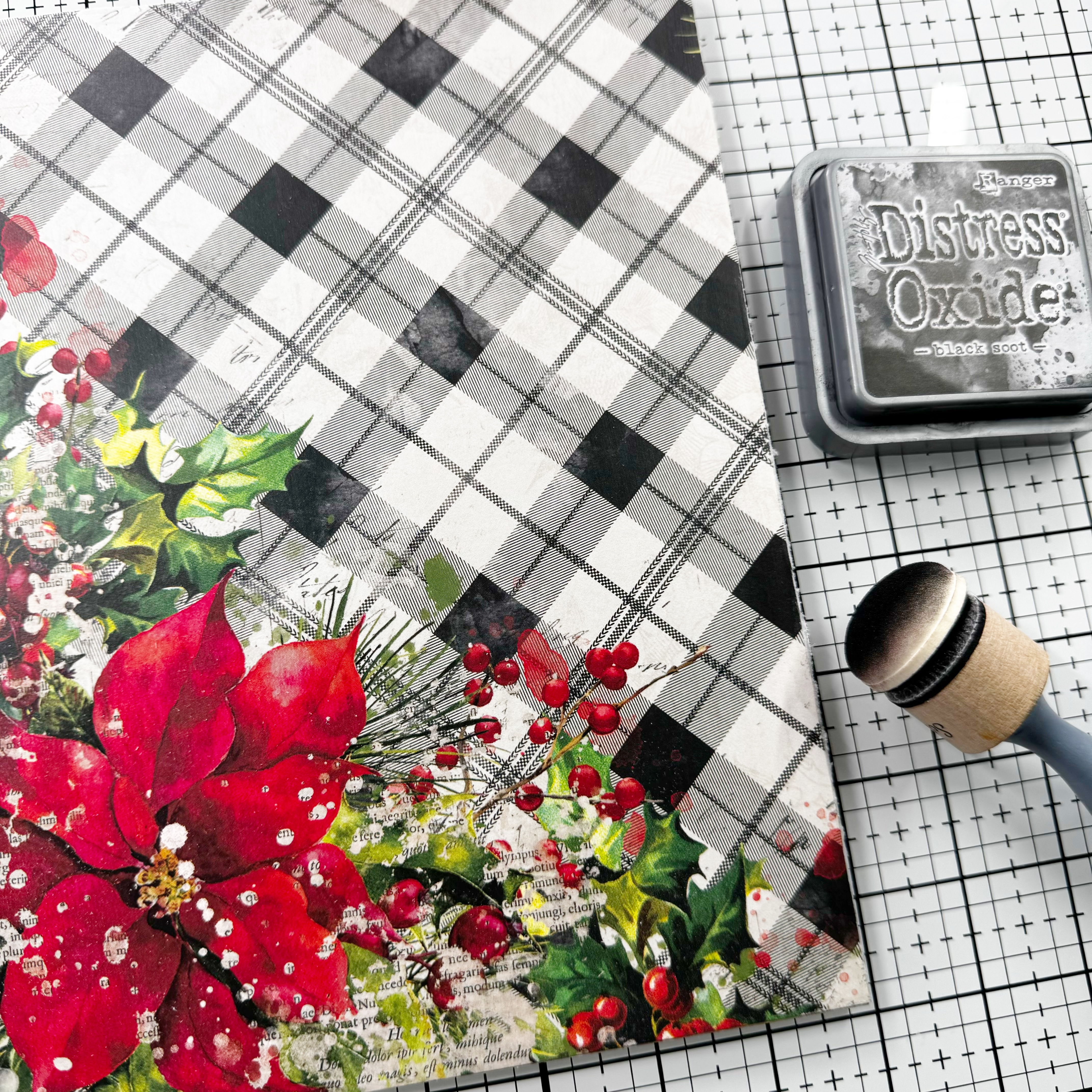 I looked through my Christmas patterned papers and decided to use the Christmas Spectacular collection from 49 and Market. I cut my favorite piece down to 8"x10". This is the piece that will go in the frame of my project. I then applied modge podge in matte finish to the large back panel. I used a scraper to get good even coverage and smooth out any bubbles. Next I applied a thin layer of modge podge to the top to seal it. I brushed some distress oxide ink in the color black soot to all the edges.