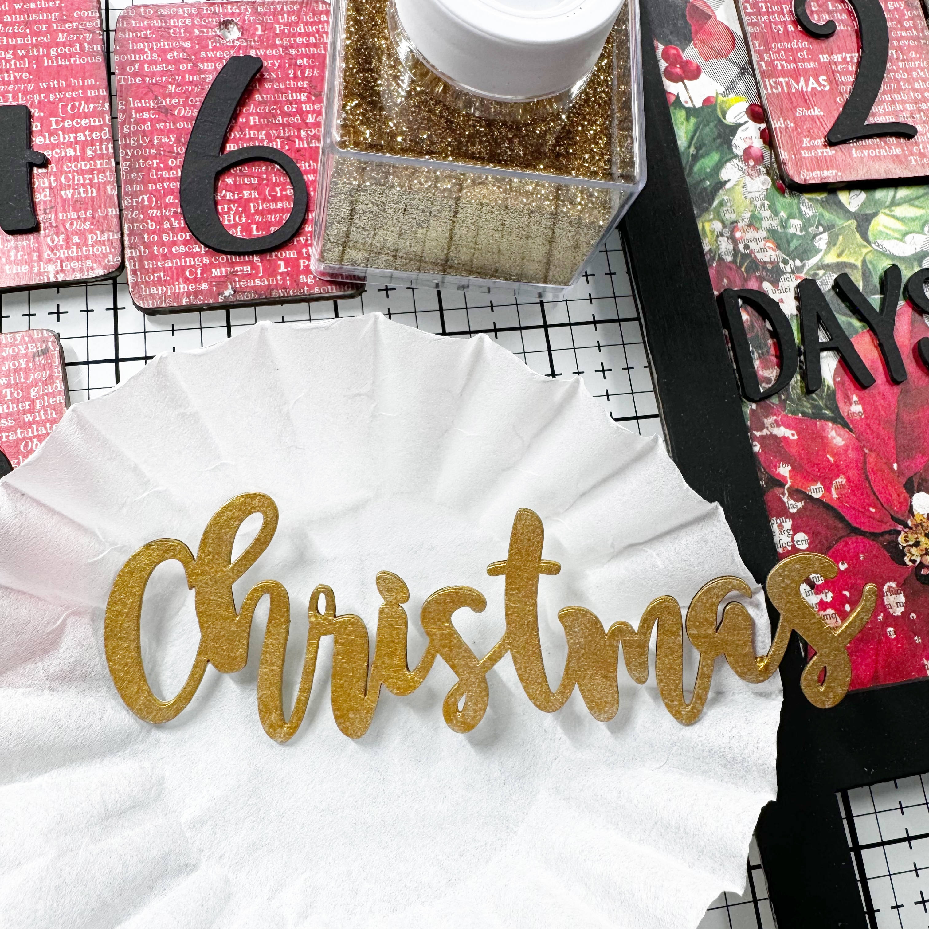 I painted the frame and the numbers with black paint. I then adhered the frame to the panel. I picked out another sheet of patterned paper and cut pieces down to fit the 2"x3.25" tags. I adhered them down the same way using modge podge. I wish I would've traced the hole for the tag and used a hole punch. This would've been much easier. Instead I adhered and then tried to hole out the center with a pokey tool. I pulled out a sanding tool and sanded down all the edges. For the word Christmas I applied gold metallic paint. Then I applied a thin coat of art glitter glue and poured some gold glitter onto the title. I used a t-square ruler to make sure the words were straight and applied "Days Until Christmas" to the panel.