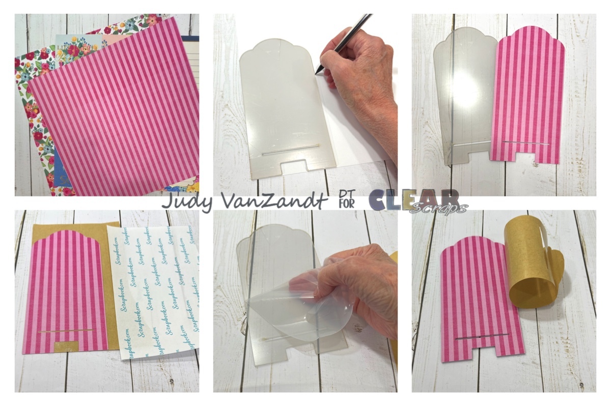 To adhere the paper to the acrylic I used an adhesive sheet. I placed the patterned paper backside down on the adhesive and trimmed.