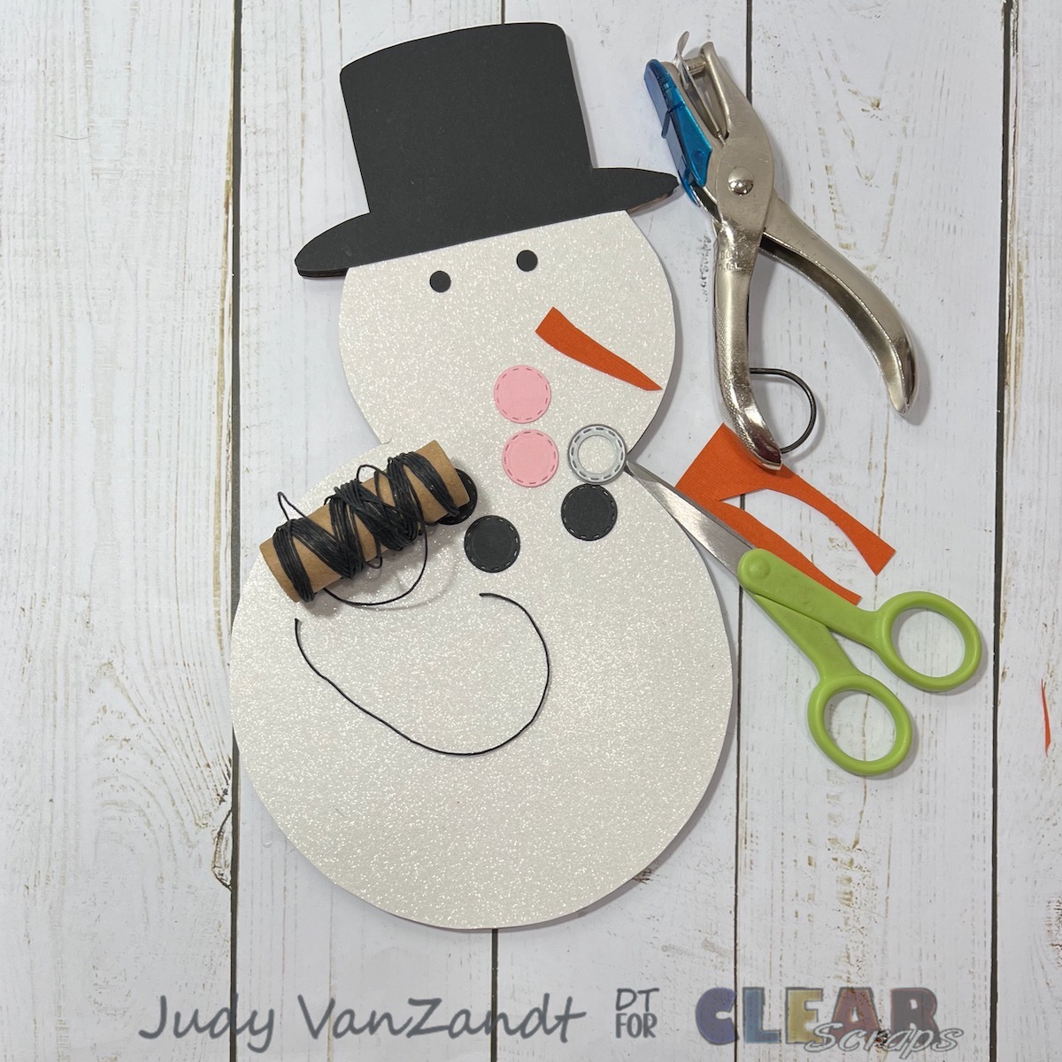 I die cut some pink circles for cheeks, 3 black circles for buttons, punched 2 black pieces for eyes and hand cut an orange nose.