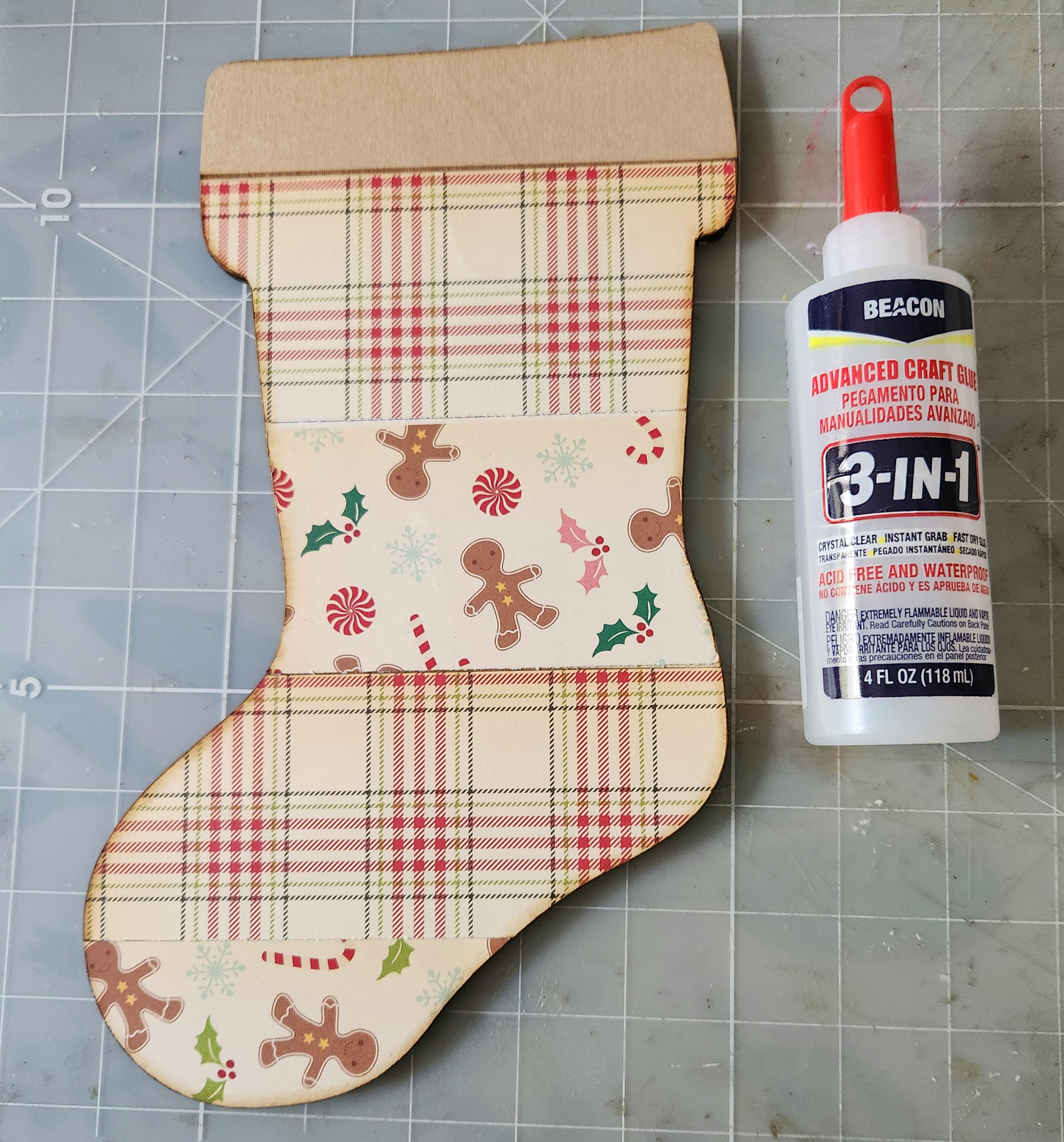 To begin our project, I chose 2 coordinating patterned papers and cut to fit each wood section on my Shiplap Stocking. I trimmed away any excess paper using my x-acto knife. I recommend using a strong adhesive like Beacon glue to adhere your papers to your wood surface.