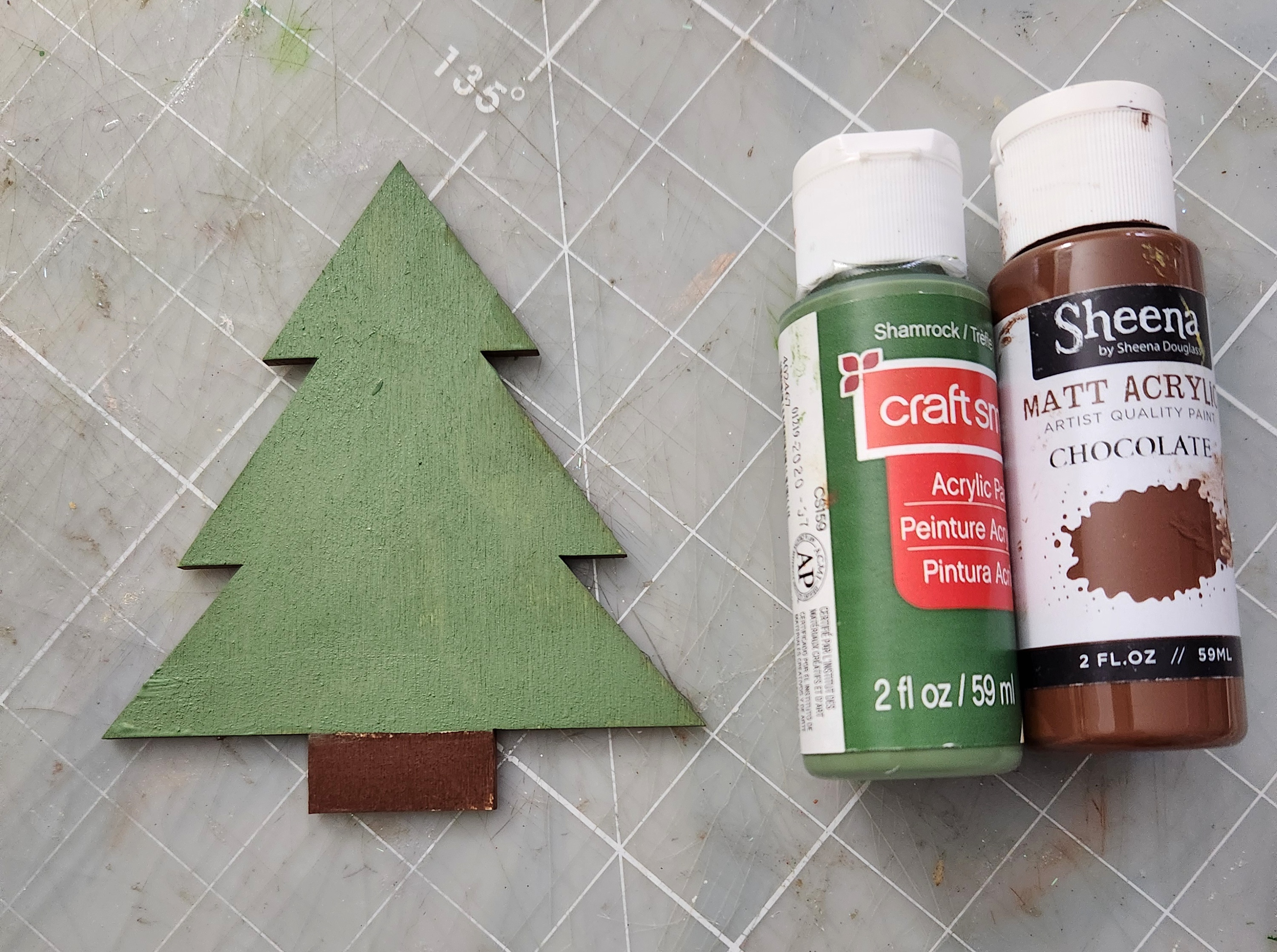 I applied Brown acrylic paint to the base of my Christmas tree shape. On my tree, I applied some Green acrylic paint. Let dry. See photo: