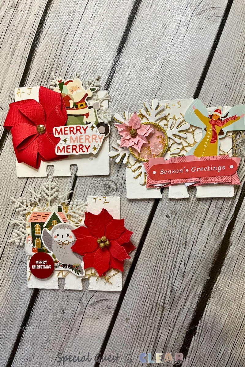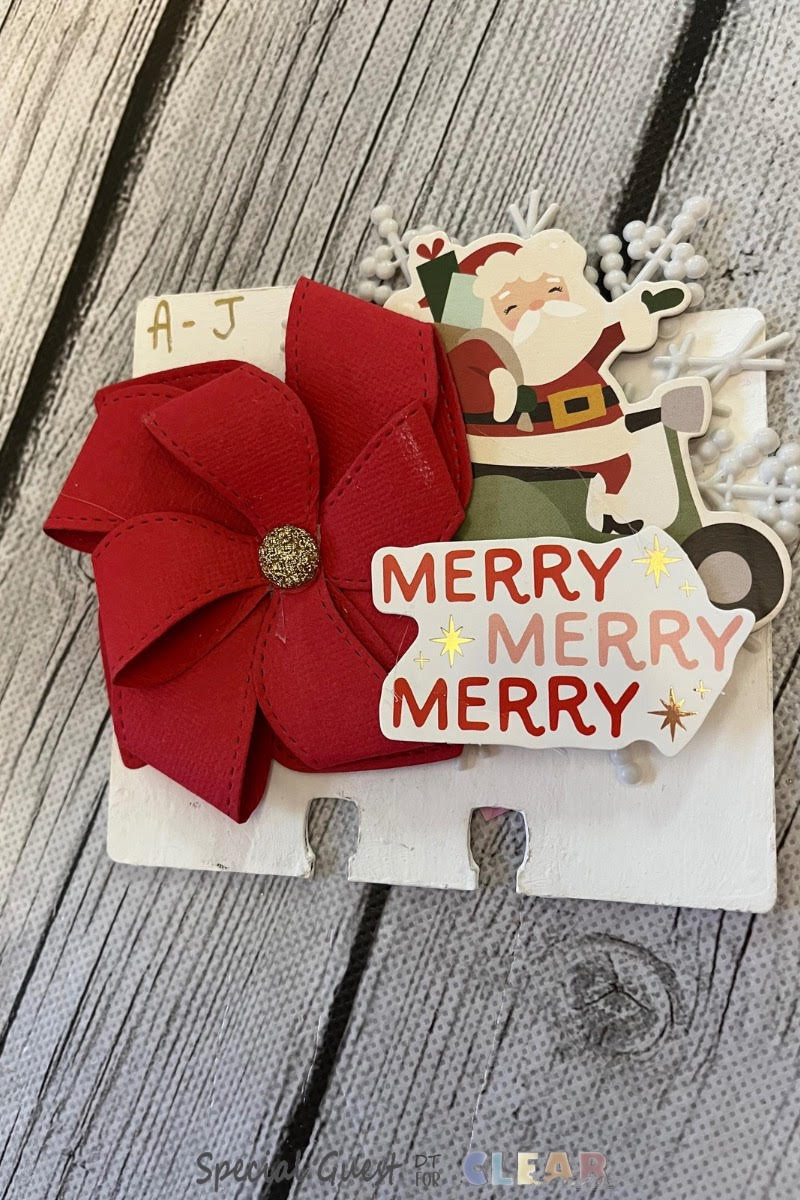 After they dried, I picked a focal point for the first MDC- which happens to be this red gift bow that I die cut and assembled! I then added a gold glitter gem to the center of the bow to embellish it! I used a white plastic snowflake Christmas tree ornament that I picked up from dollar tree as a background layering piece & then I found this chipboard sticker of a Santa riding a scooter and added it for some extra decoration. I finished the first one off with this "Merry Merry Merry" Sentiment !