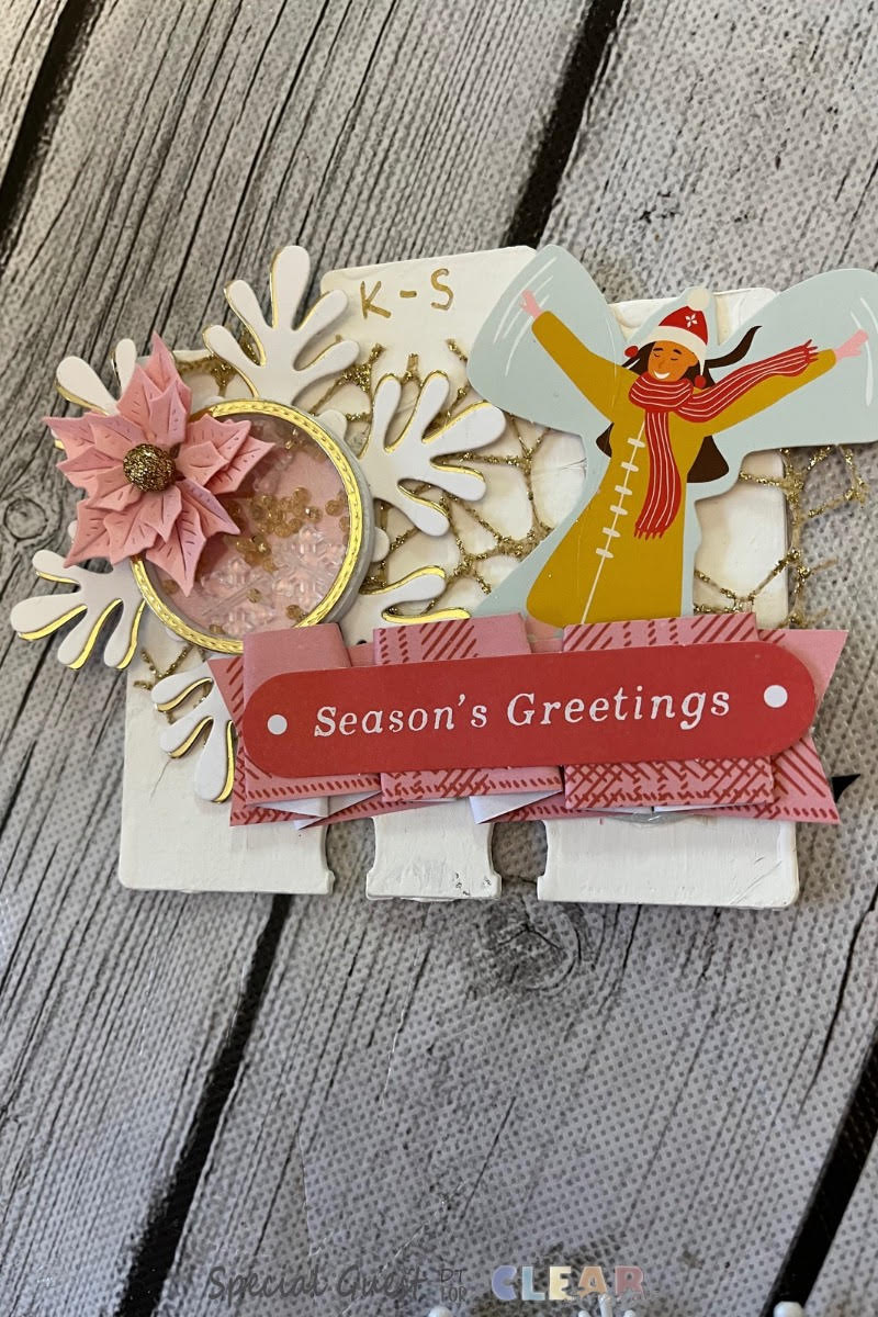 For my second MDC Divider, I used a snowflake shaker embellishment that was gifted to be in happy mail as the focal point! I used this beautiful gold glitter mesh in the background for layering purposes, found an ephemera piece of this girl making snow angels and then I sewed a paper ruffle to add some dimension and layered the sentiment " Season's Greeting's" on top to finish it!