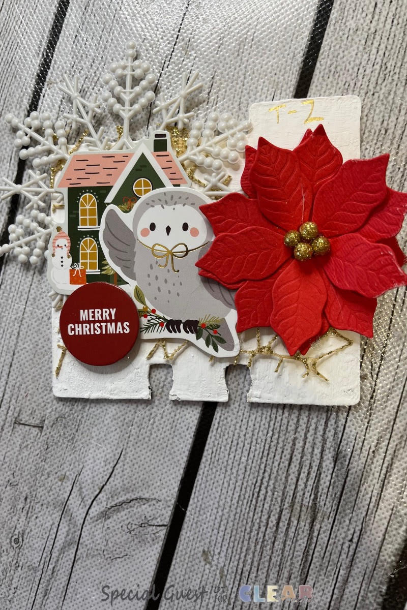 For my third and final MDC Divider, I made this gorgeous Poinsettia flower, as my focal point, by die cutting and assembling it. To embellish the center, I used these small gold glitter foam balls that I picked up from Hobby Lobby in the Christmas section. I used another white plastic snowflake ornament from dollar tree as well as some more of that gold glitter mesh for layering and then found a couple of ephemera pieces (the house and the snow owl!) to make a little winter scene. I finished this last one off with a circle chipboard sticker that says "Merry Christmas"!