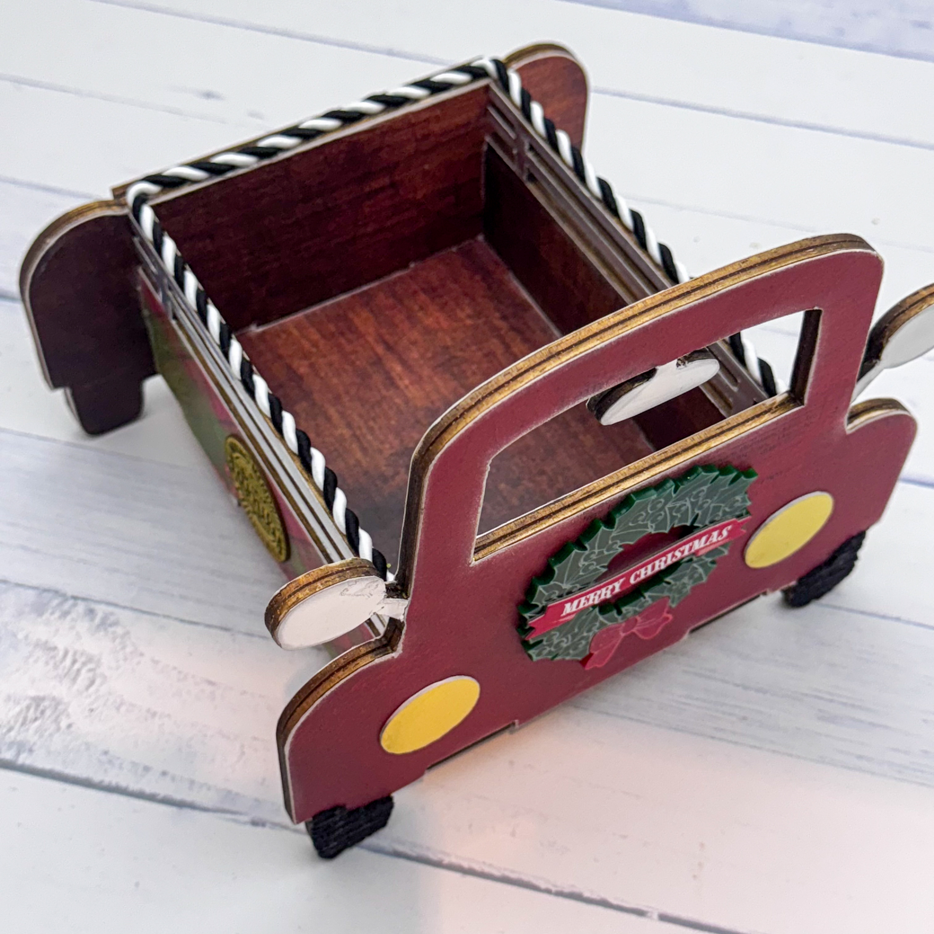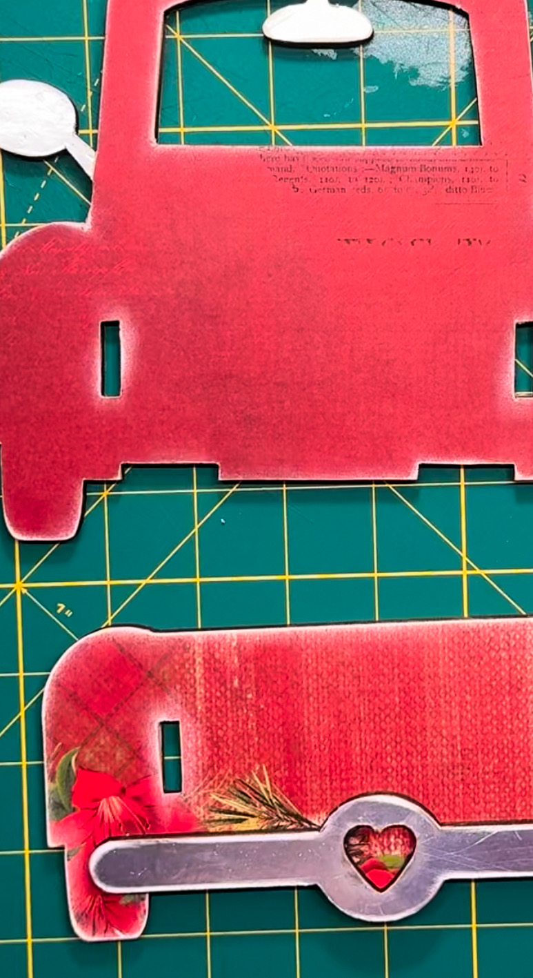 I LOVE IT! When I came back the next morning to finish my Little Red Truck, it was so stinking CUTE!! I started adding some adornments to decorate the outside, but I didn't want to add too much. At this point, I had not put anything into the bed of the truck. You can see that I used a woodgrain paper to line those exposed areas also.