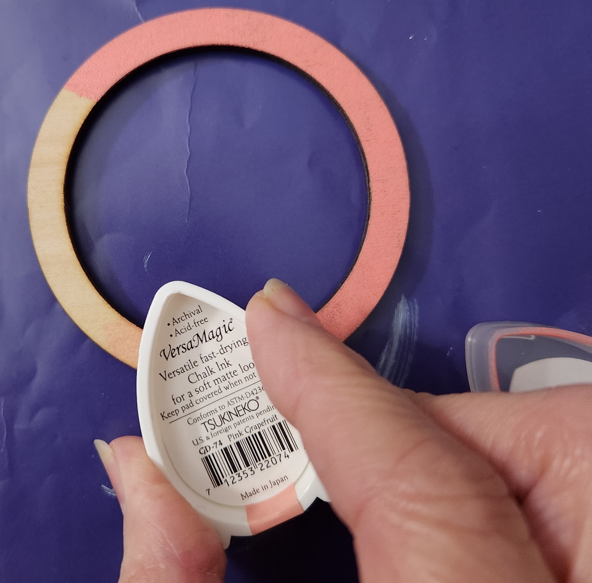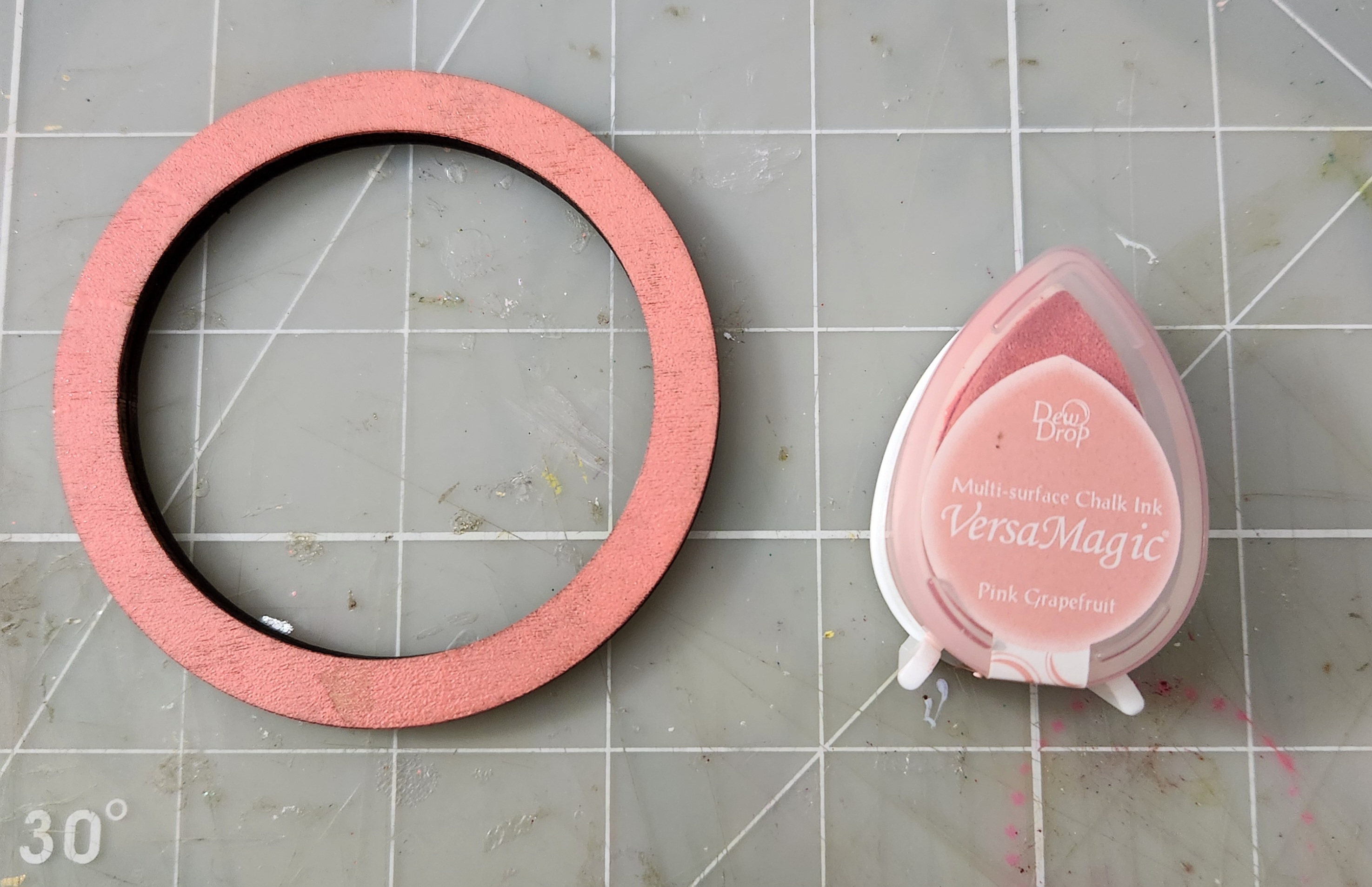 To start this project, remove your Mason jar wooden pieces from your package. Take one of the skinny rings and cover with Versa Magic Pink Grapefruit Ink. Sprinkle over top some Clear Embossing powder and heat emboss. See photo: