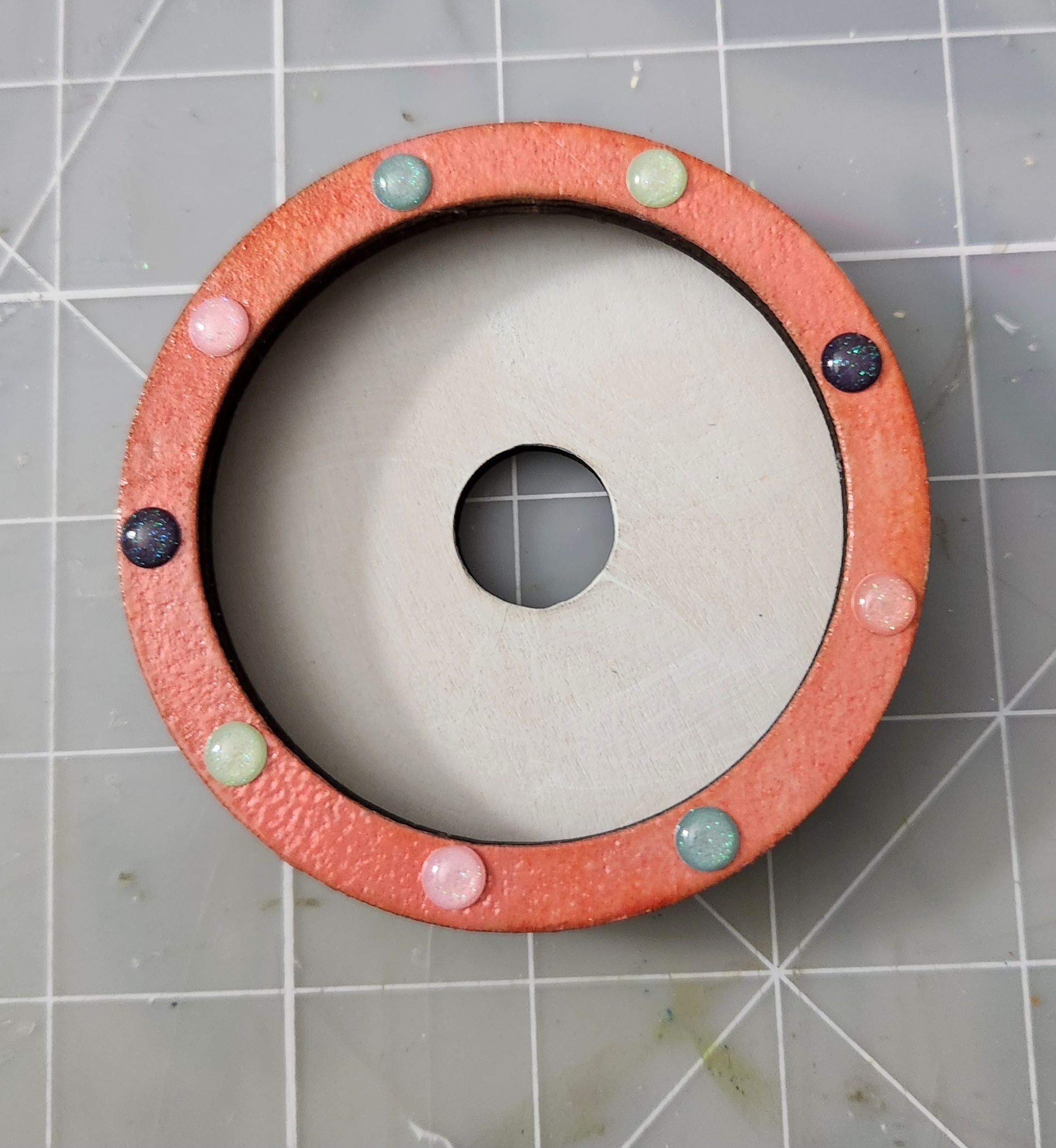 Take the Wooden piece with the hole and apply Folkart Cottage White acrylic paint. Set aside to dry. After your ring is dry, i applied some enamel dots around the edge. Then glue one of the skinny small wood rings to the top of your wood piece with the hole. See photo: