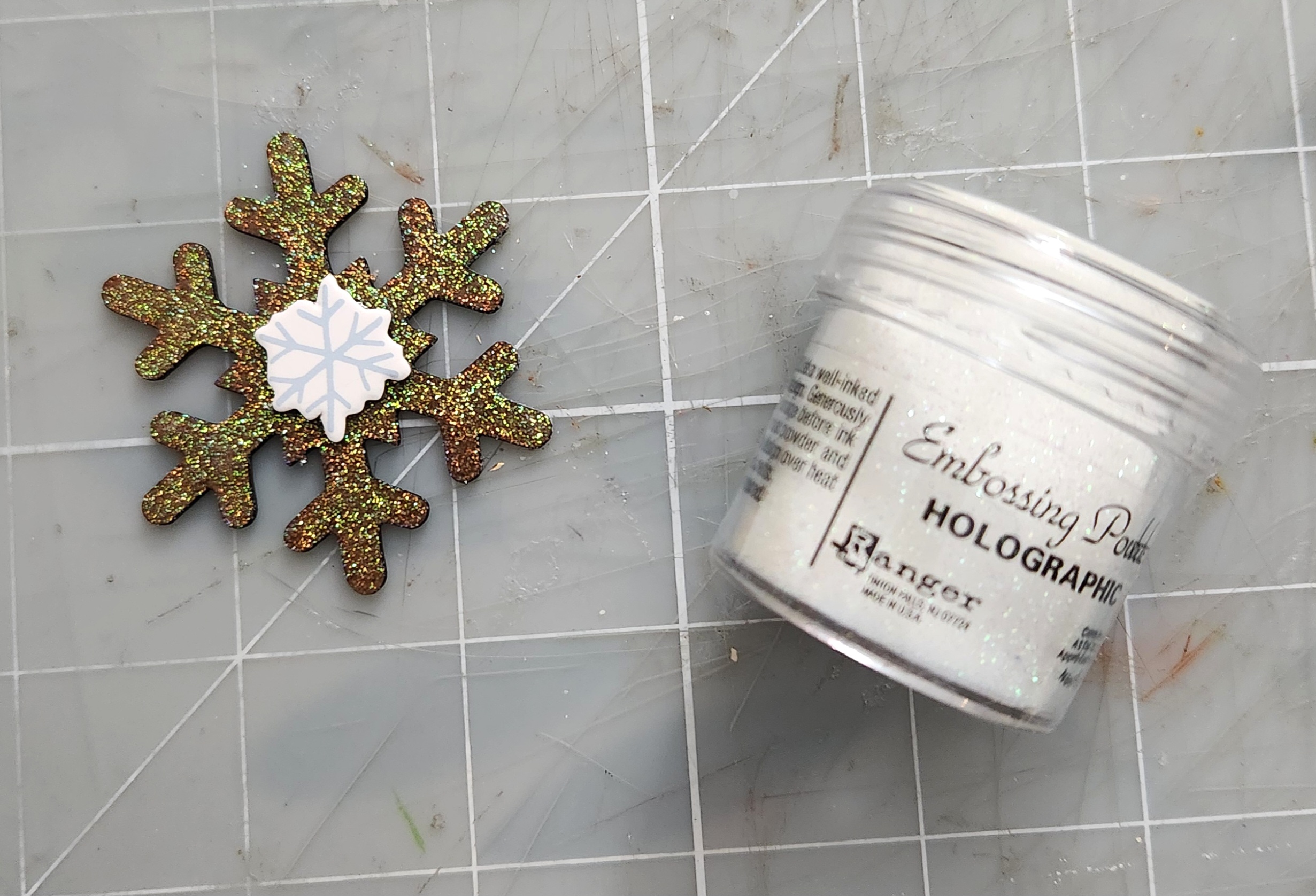 For the Snowflake Punchout I applied some Versamark Clear ink and sprinkled some Holographic Embossing powder. Heat emboss with your heat tool. I added a chipboard sticker Snowflake in the center. The Snowflake does look more shimmery but hard to tell on my photo. Here's a photo:
