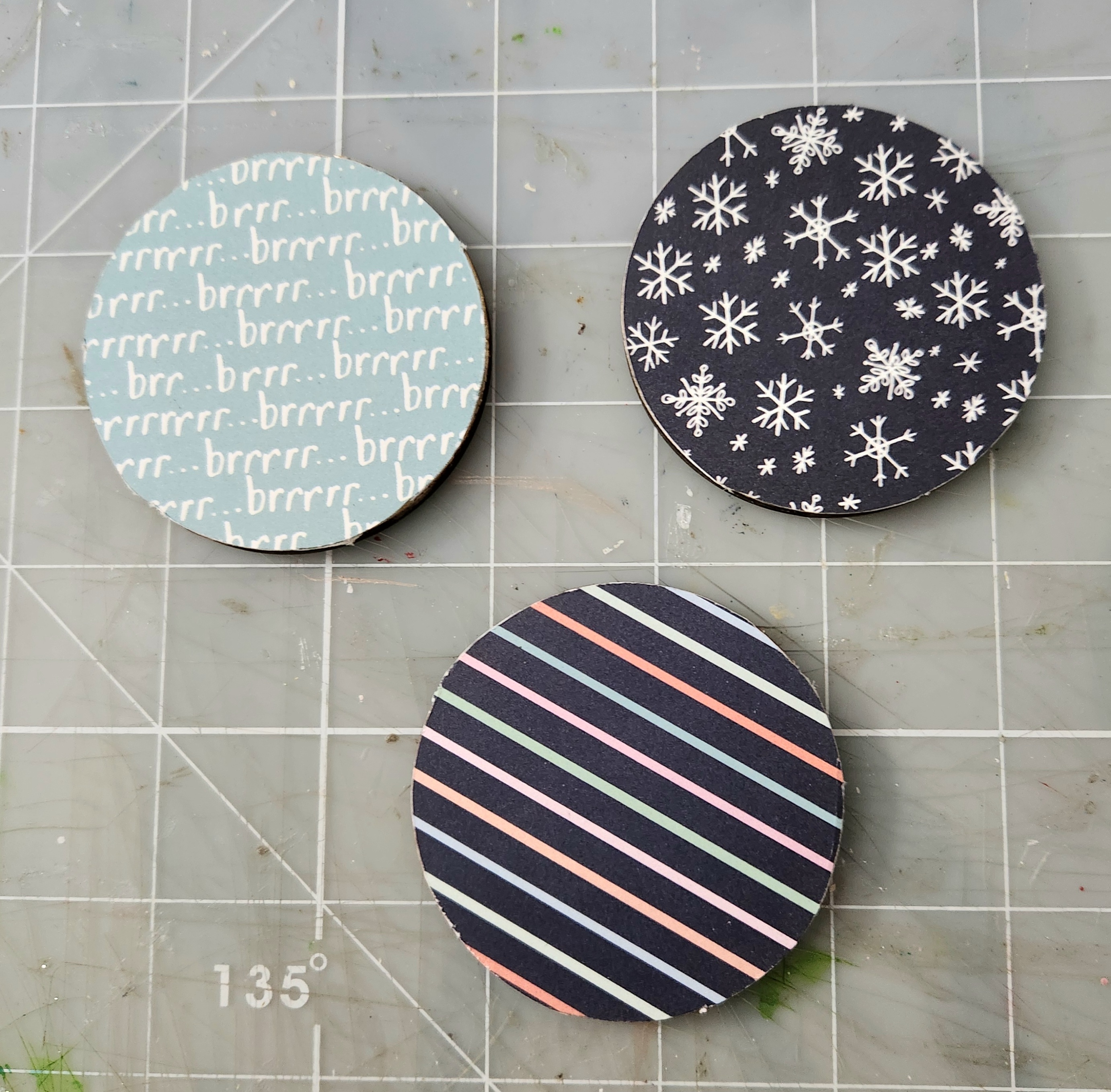 Next I chose 3 different patterned papers to cover my 3 Wooden Mason jar covers. I also chose another patterned paper to cover both Chipboard mittens and another paper to cover the sweater.