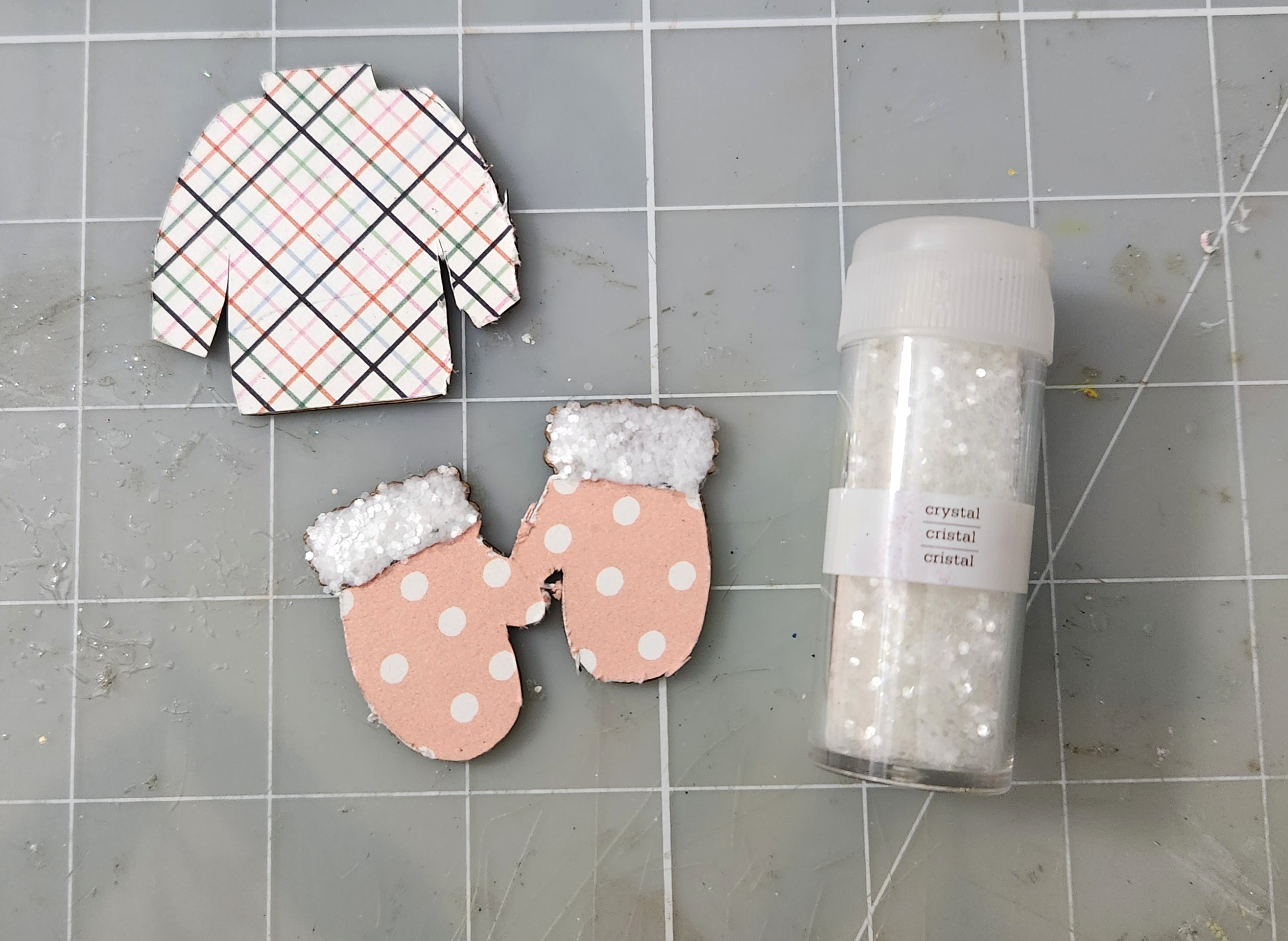On my mittens Chipboard punchout I applied some Versamark Clear ink and sprinkled some fine glitter over top.