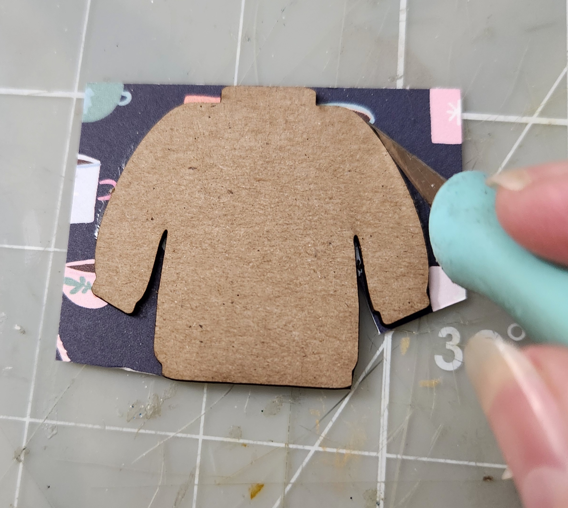 I cut a piece of patterned paper and glued to my sweater Punchout. Then trim with an x-acto knife as we did with the mittens.