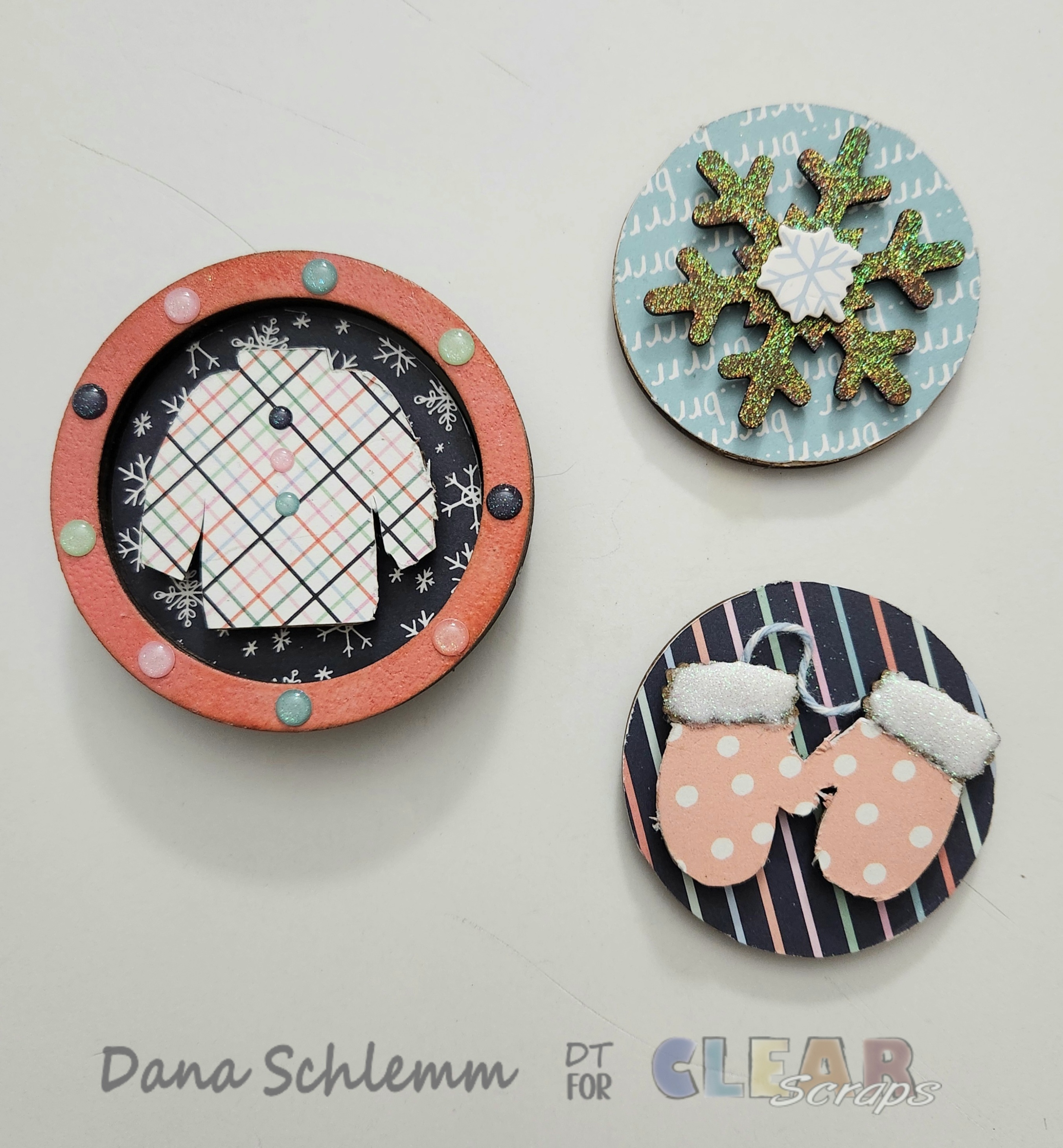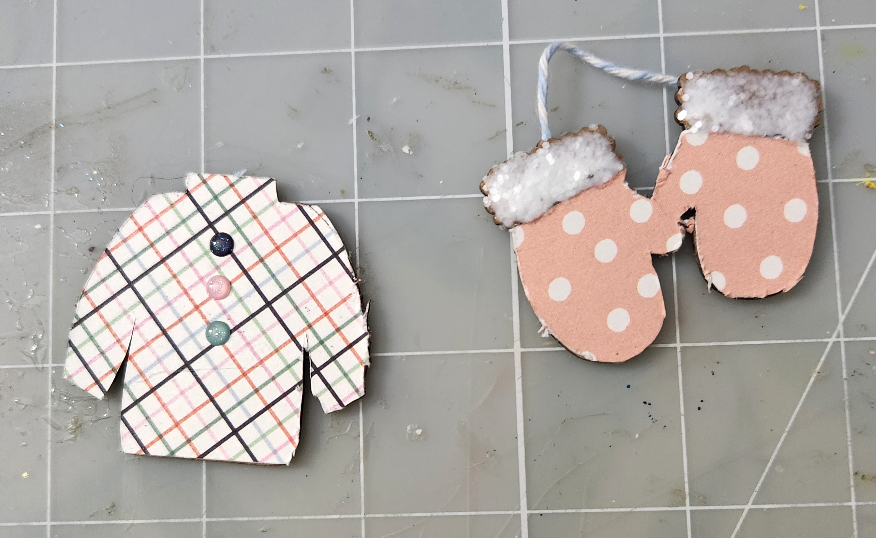 Then heat emboss. I cut a small piece of jute cord and glued to the back of each mitten the sweater I applied a few enamel dots to the front of my sweater. See photo above.