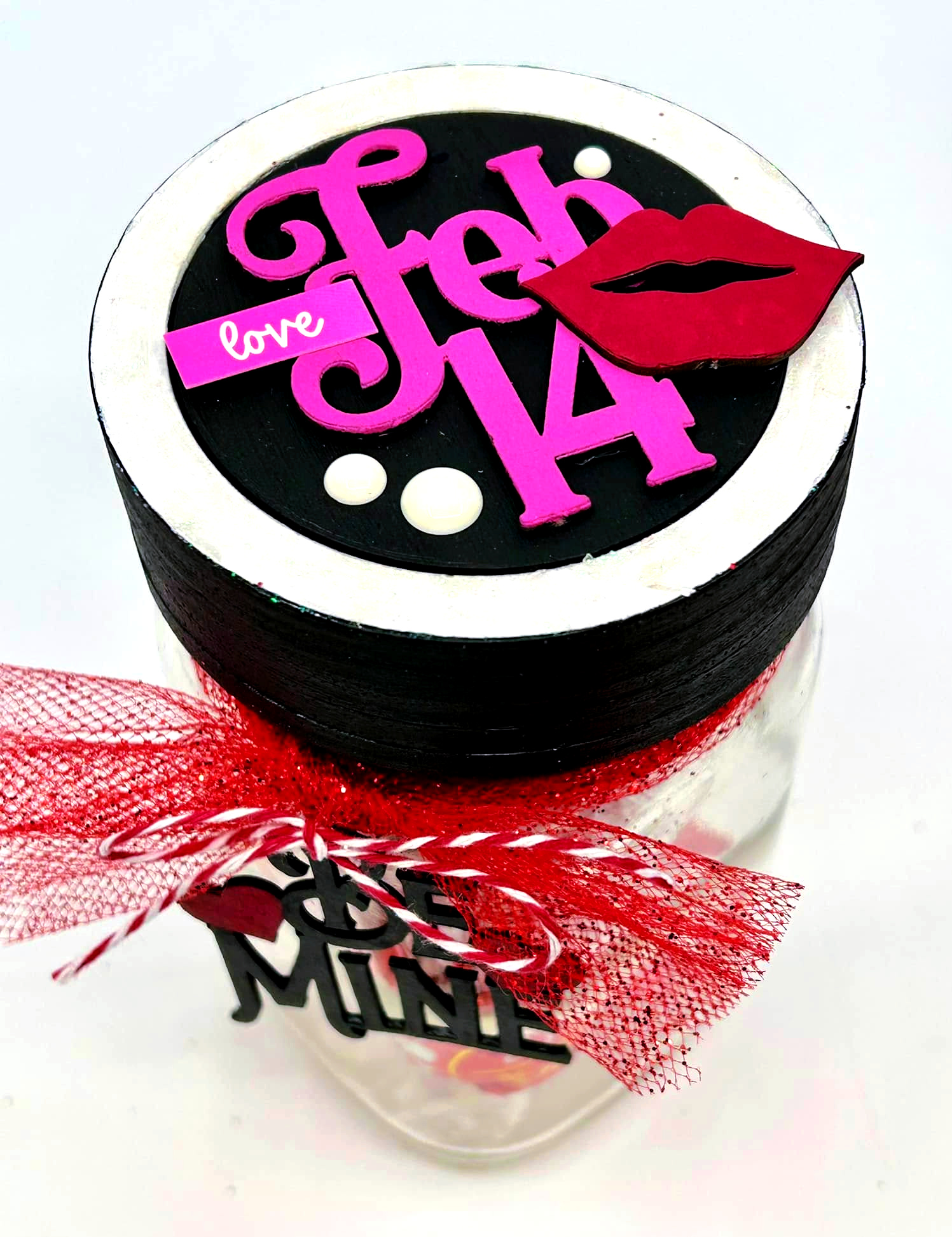 On this one, the mason jar "lid" is painted black and rimmed in white. It's hard to capture in a picture, but the edge has sparkly glitter glue around that white edge. The lids are easy to make, just layer up the rings and they make the perfect little frame for the mason jar lids. The addition of the perfectly sized chipboard pieces make this all even easier! For this lid insert, the Embellishment Chipboard Punchout LOVE was used. The were painted with acrylic paint and then I added a sentiment and a few enamel dots. All done!