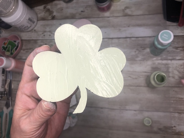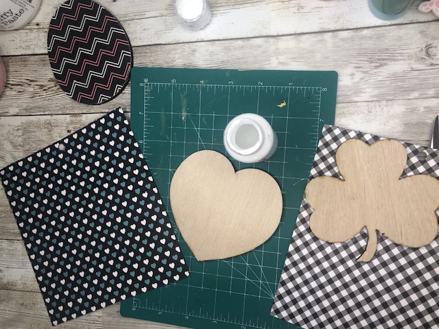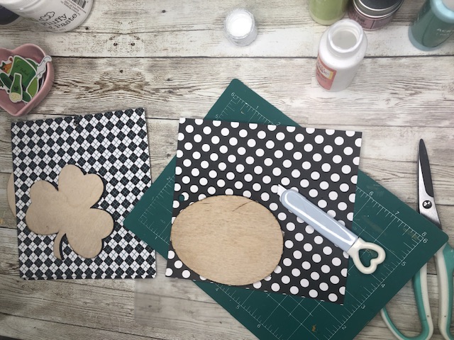 First I’ll cover with glue then apply paper and cut around the wood shapes.