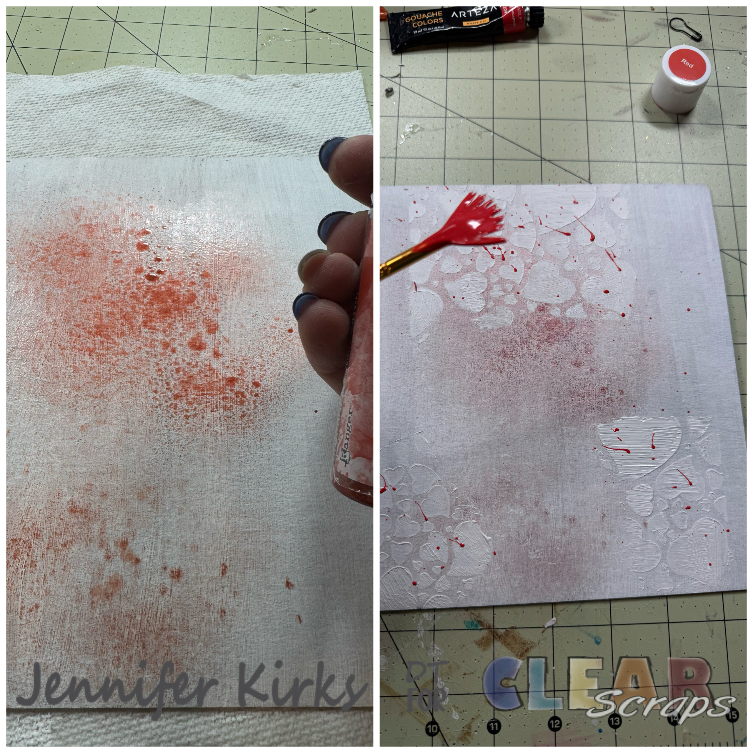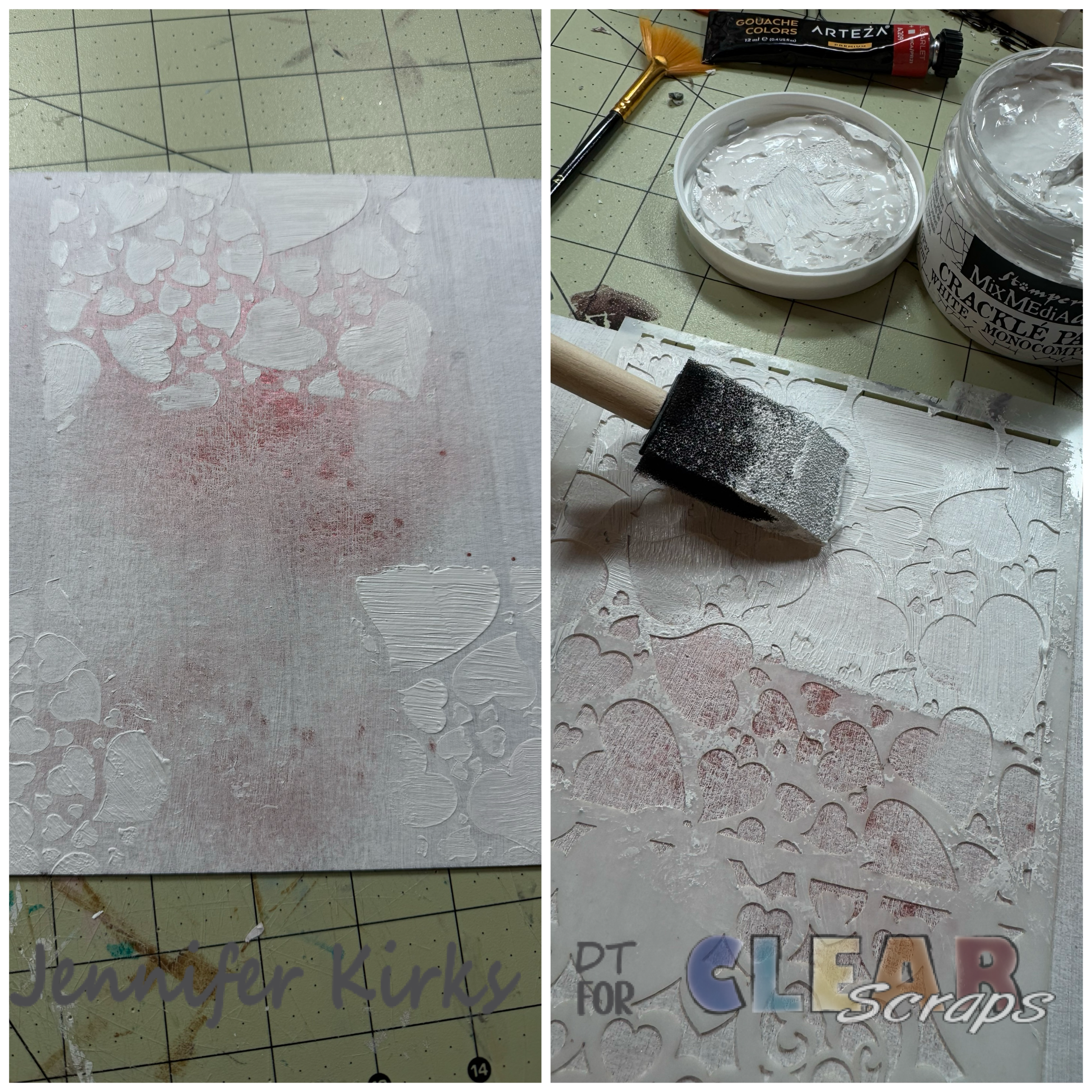 First, I prepped the front cover with a smooth base of white gesso, layering on three coats for that perfect foundation. Next, I grabbed some crackle paste and a heart stencil to add texture and dimension, creating a romantic heart pattern across the surface. Once that paste dried, I spritzed everything with Tim Holtz Metallic Distress Spray, giving it a shimmering, distressed look that catches the light just right. After all the layers had fully dried, I brought the design to life with embellishments, flowers, and a touch of ribbon for some extra flair. For the finishing touch, I painted the resin couple with a coat of clear gesso, followed by black and red paint to make them pop against the background.