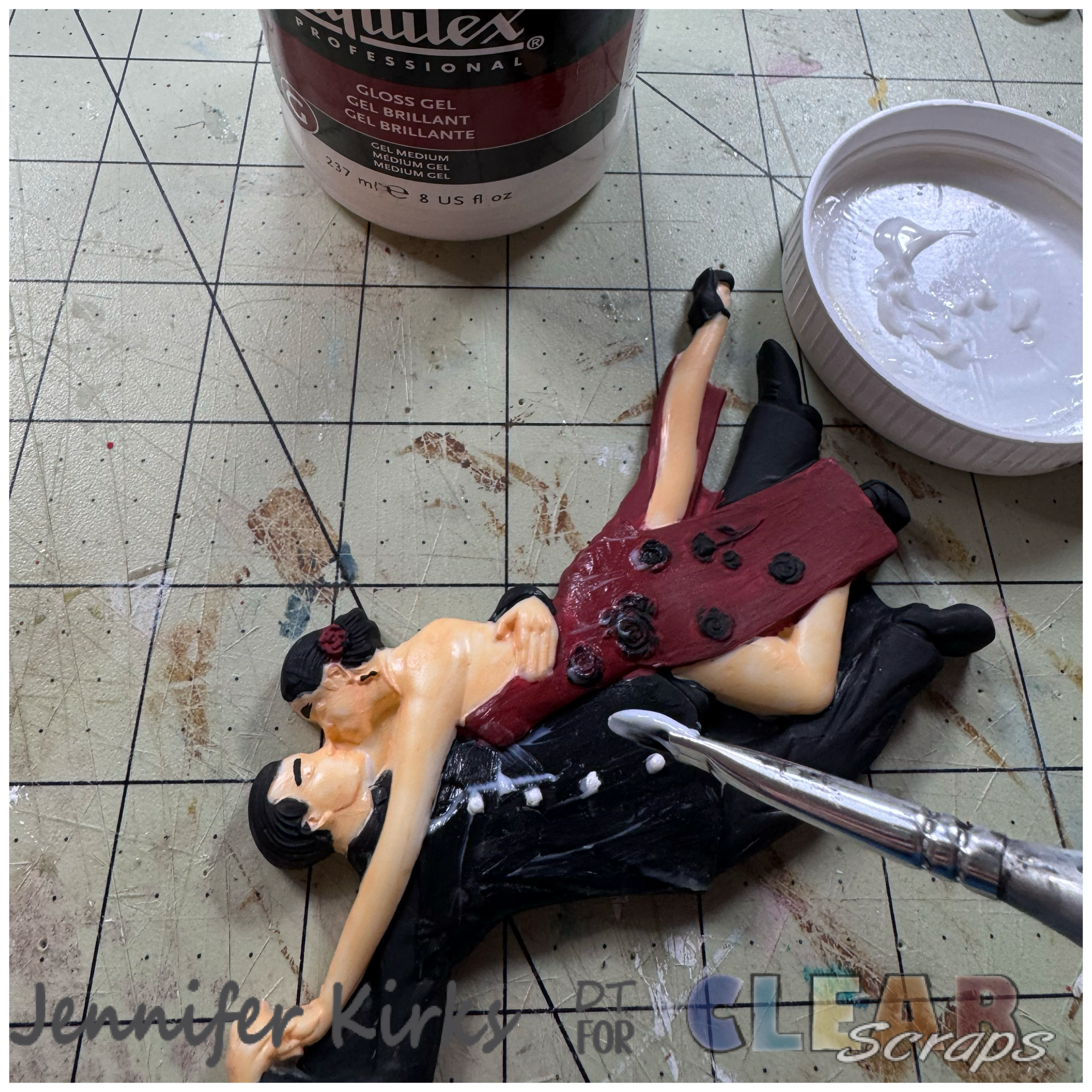 For the resin figures and carefully painted them with a mix of gloss gel and acrylic paint, giving the surface a stunning, glossy sheen once dry. To deepen the flesh tones, I added a touch of rich brown ink from Stazon, lightly dabbing it over the peachy areas to create a more natural, subdued hue.