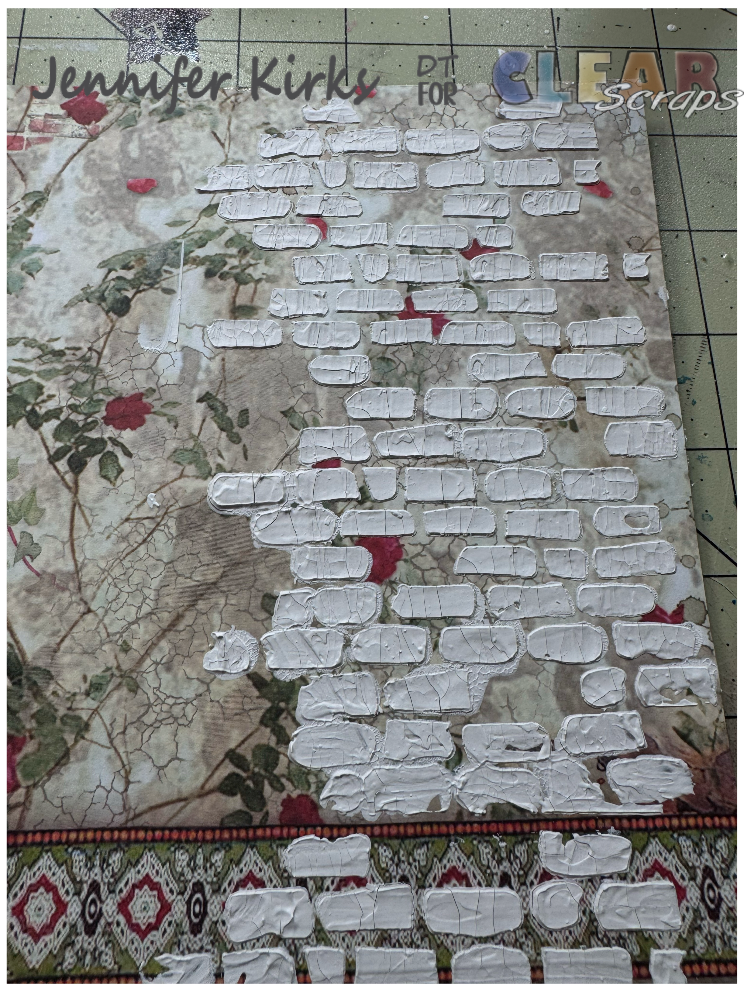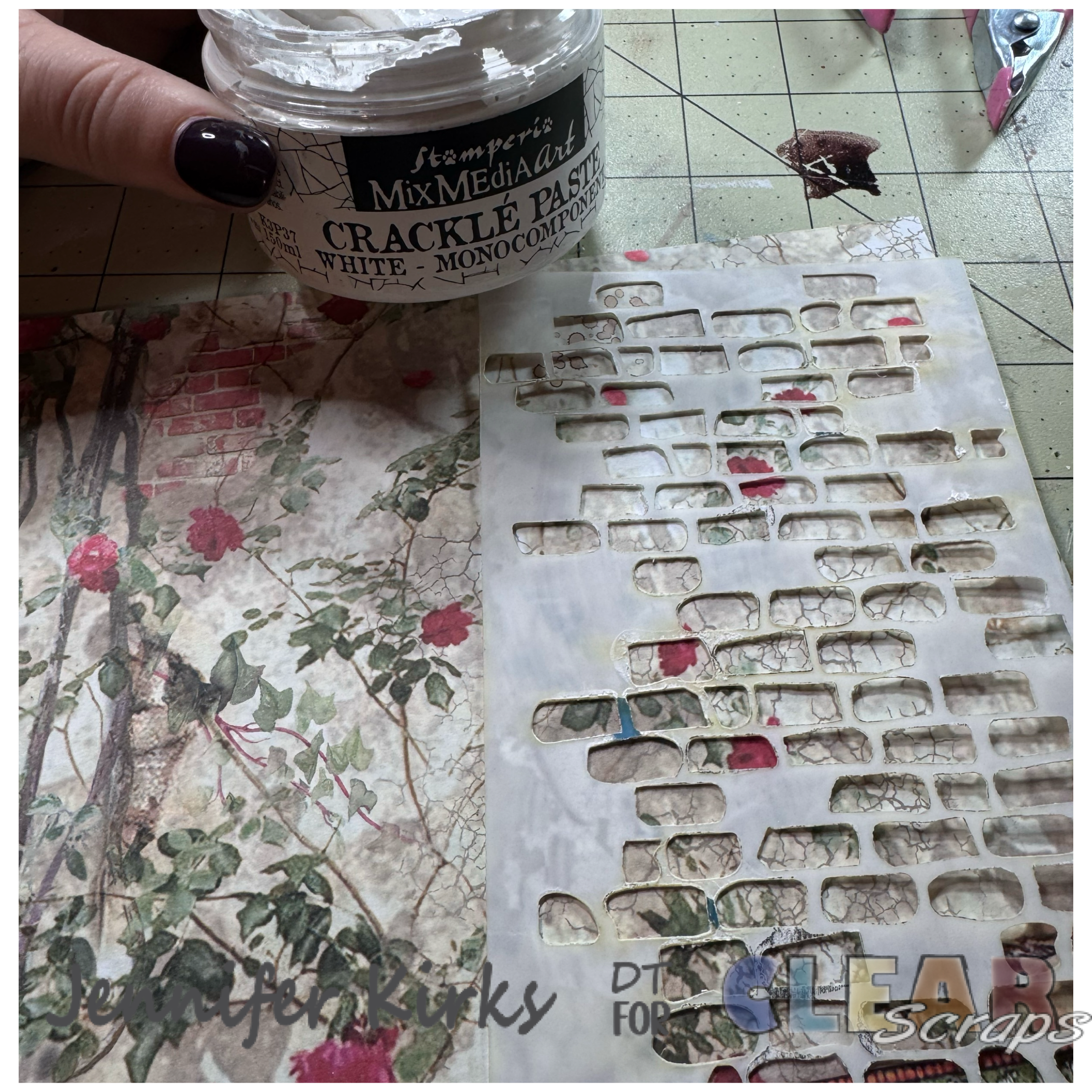 For the next page, I applied the brickwall stencil with crackle paste, giving the surface a beautifully textured, weathered effect. Then, I added a photo mat to frame and highlight that one special photo, ensuring it stands out against the backdrop of rustic charm.