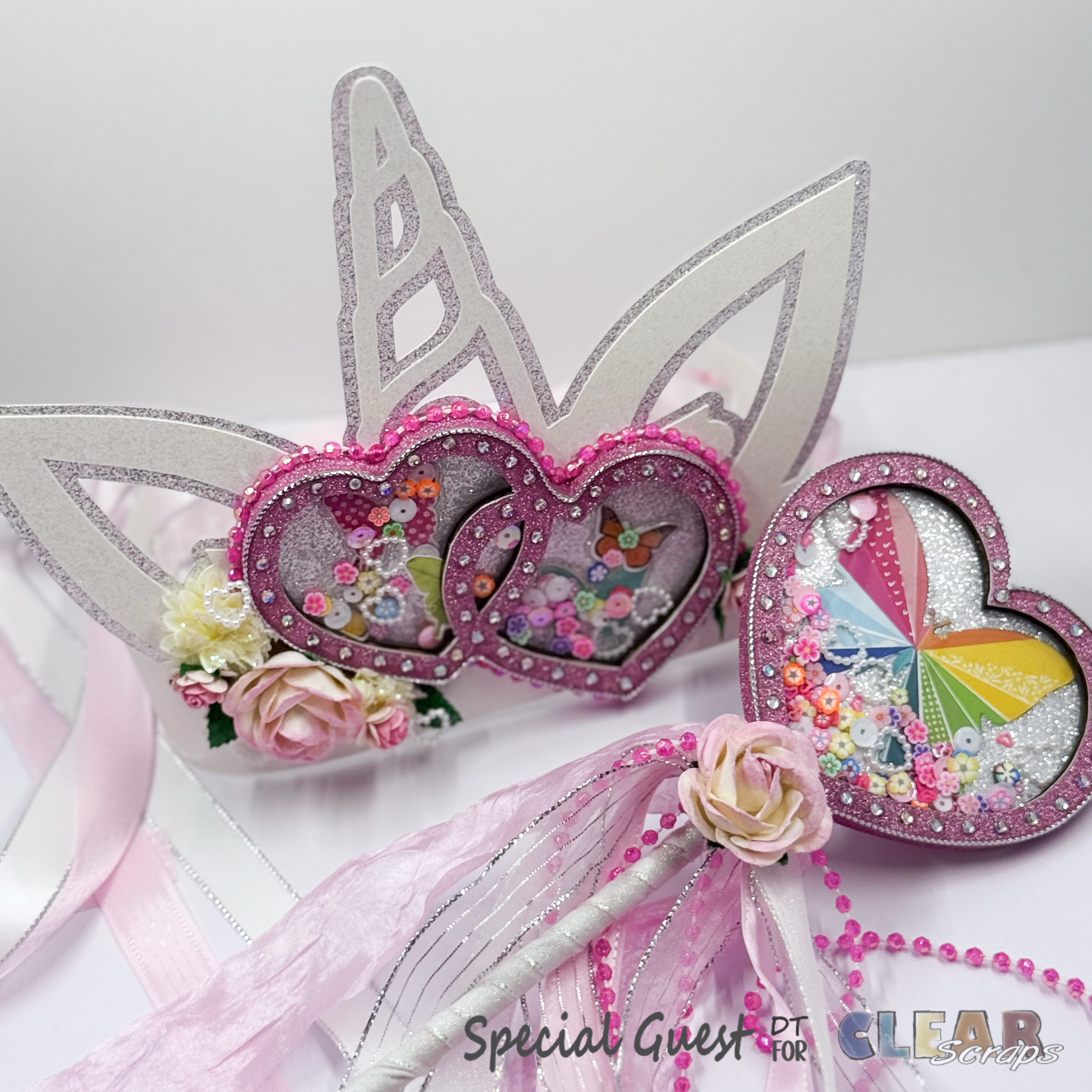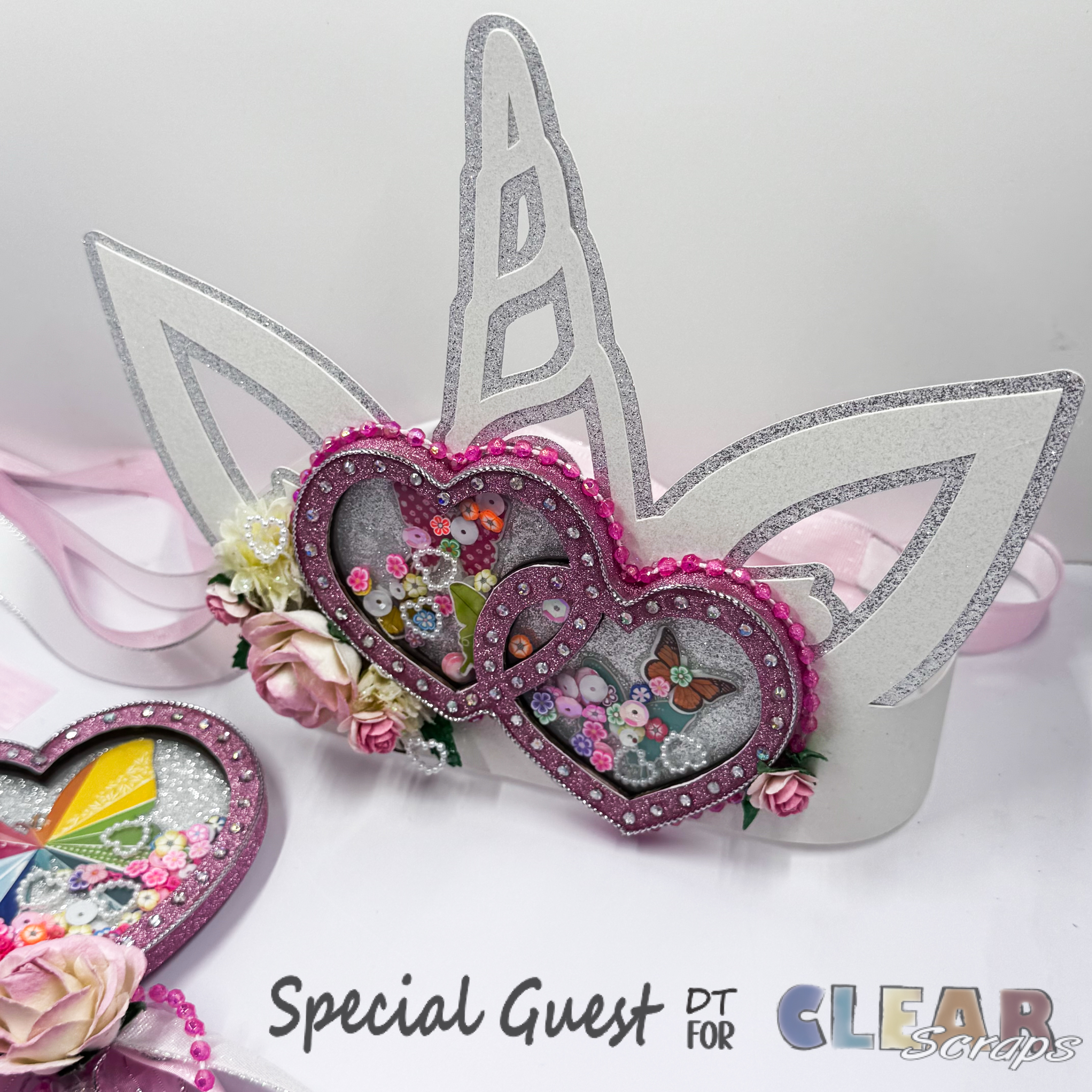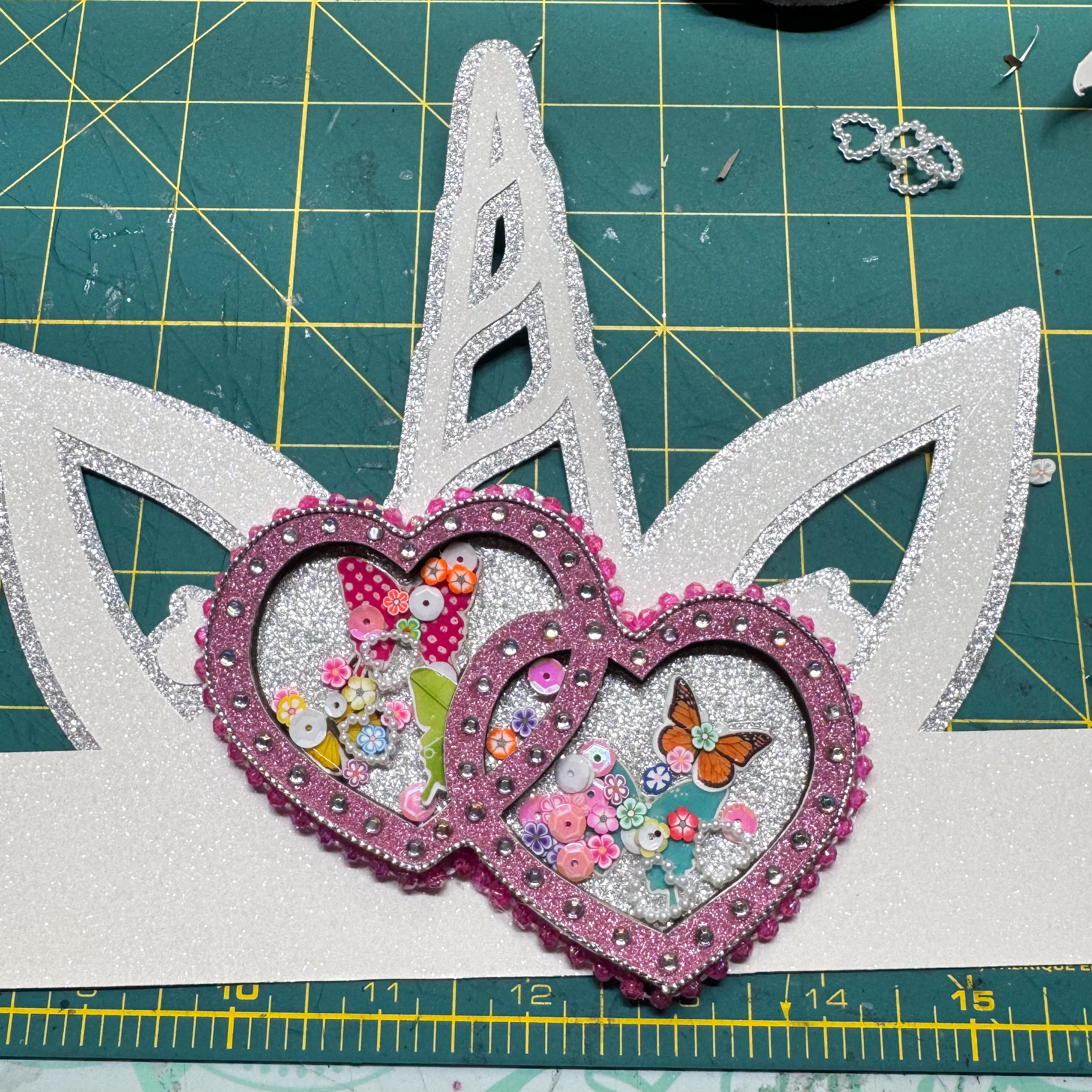 I used my Handy Dandy Cricut Maker Machine to cut out a Unicorn Crown base using the silver and white glitter Card Stock. Once it was assembled, I added the completed Mini Shaker Double Hearts to it.