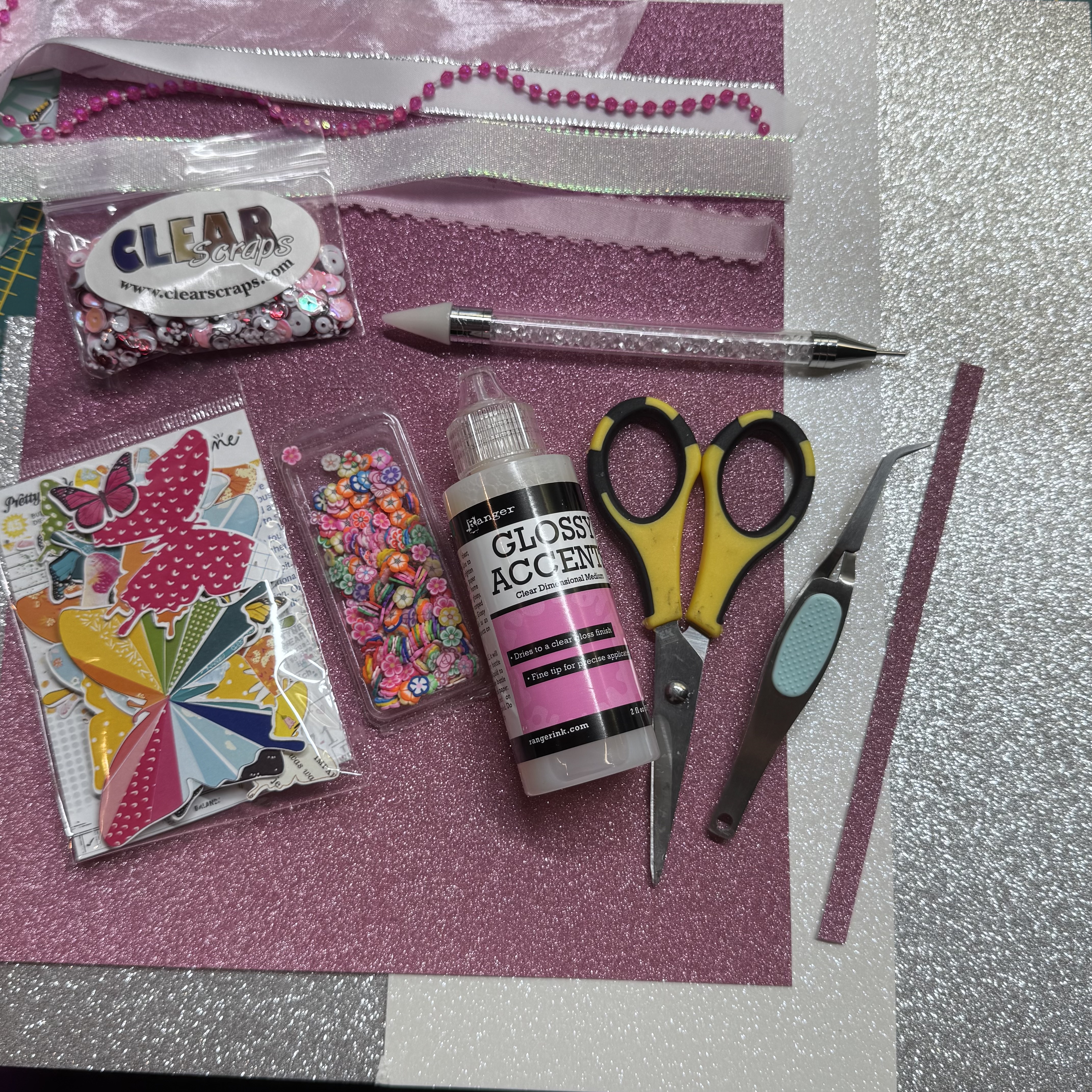 To start with, I gathered my supplies, beginning with my Clear Scraps products: