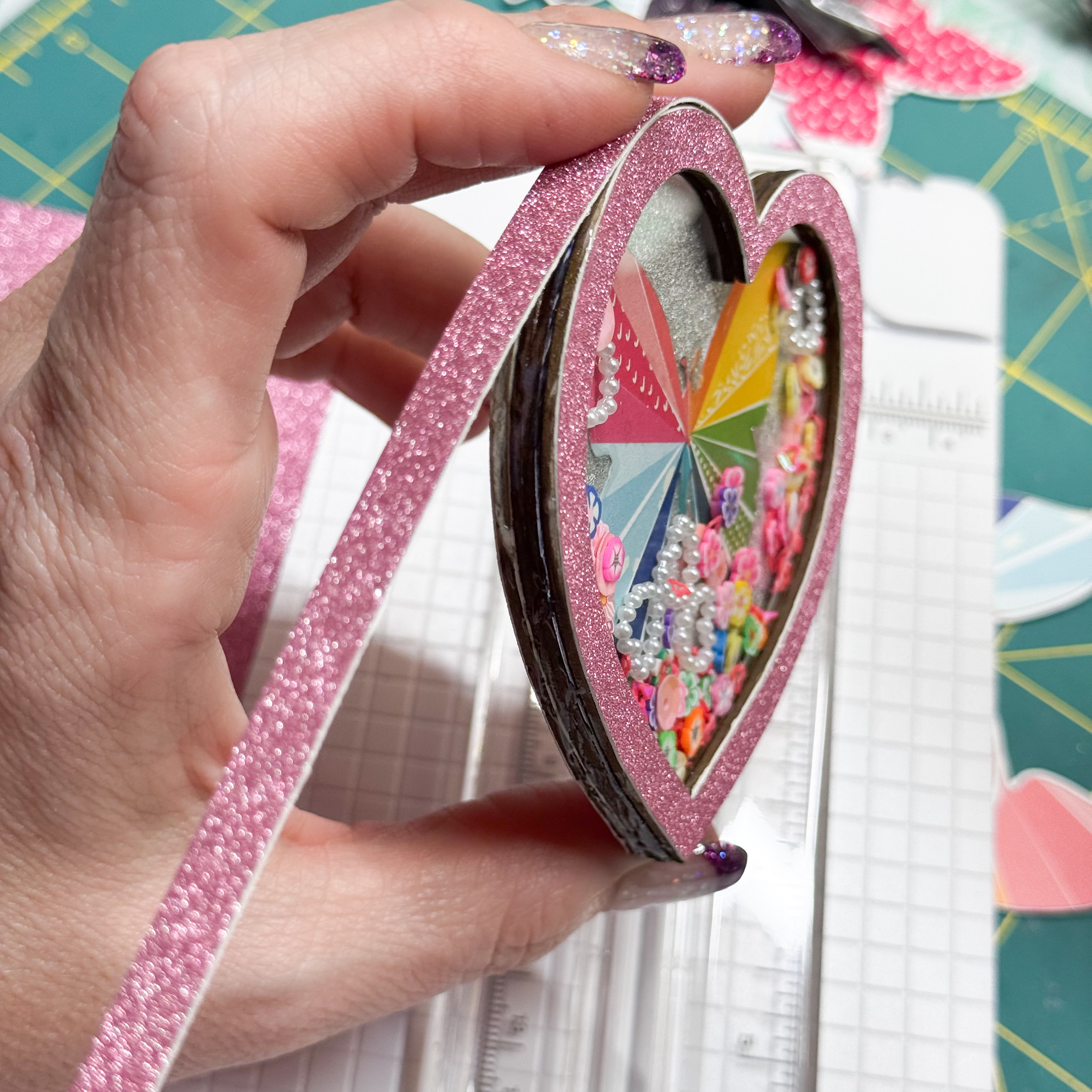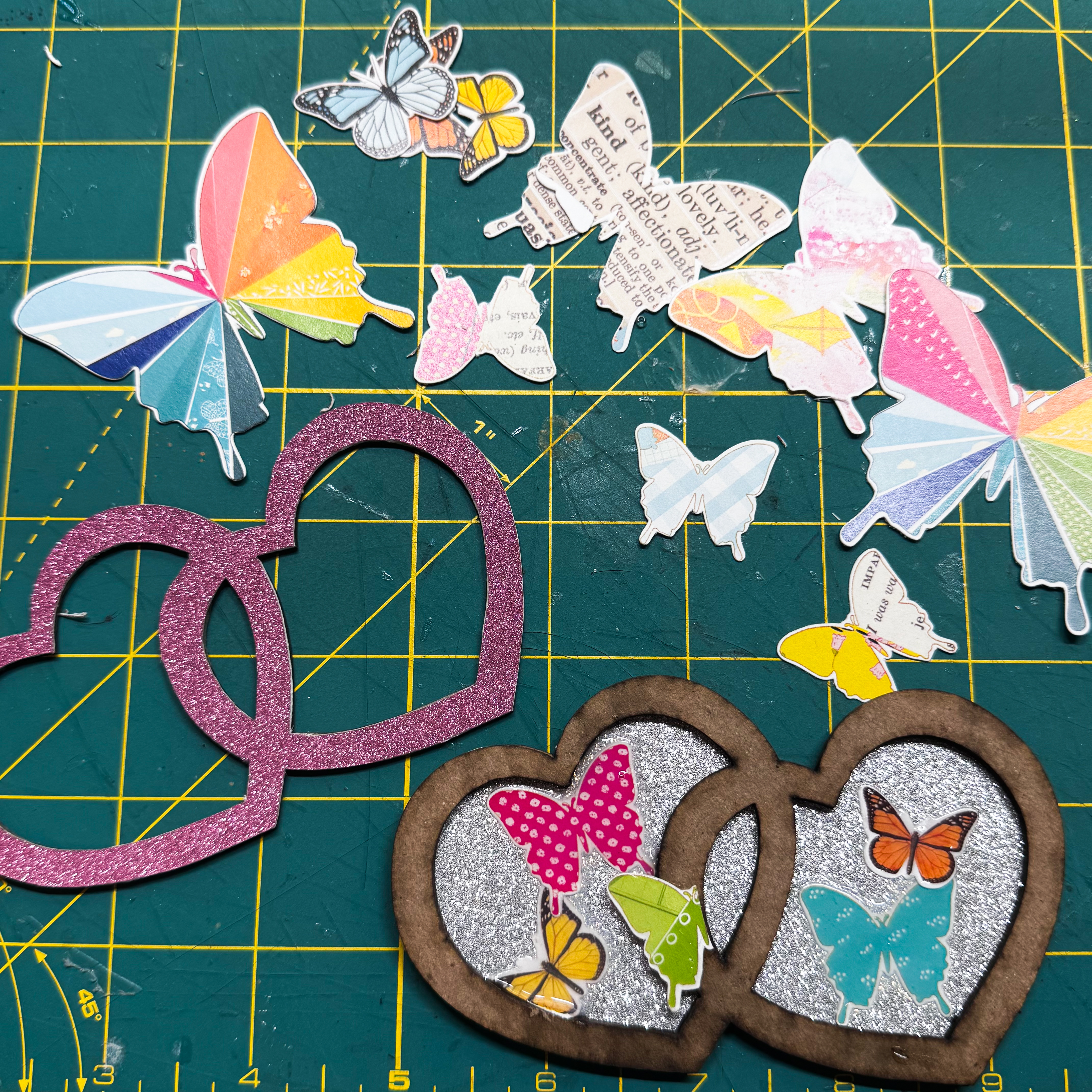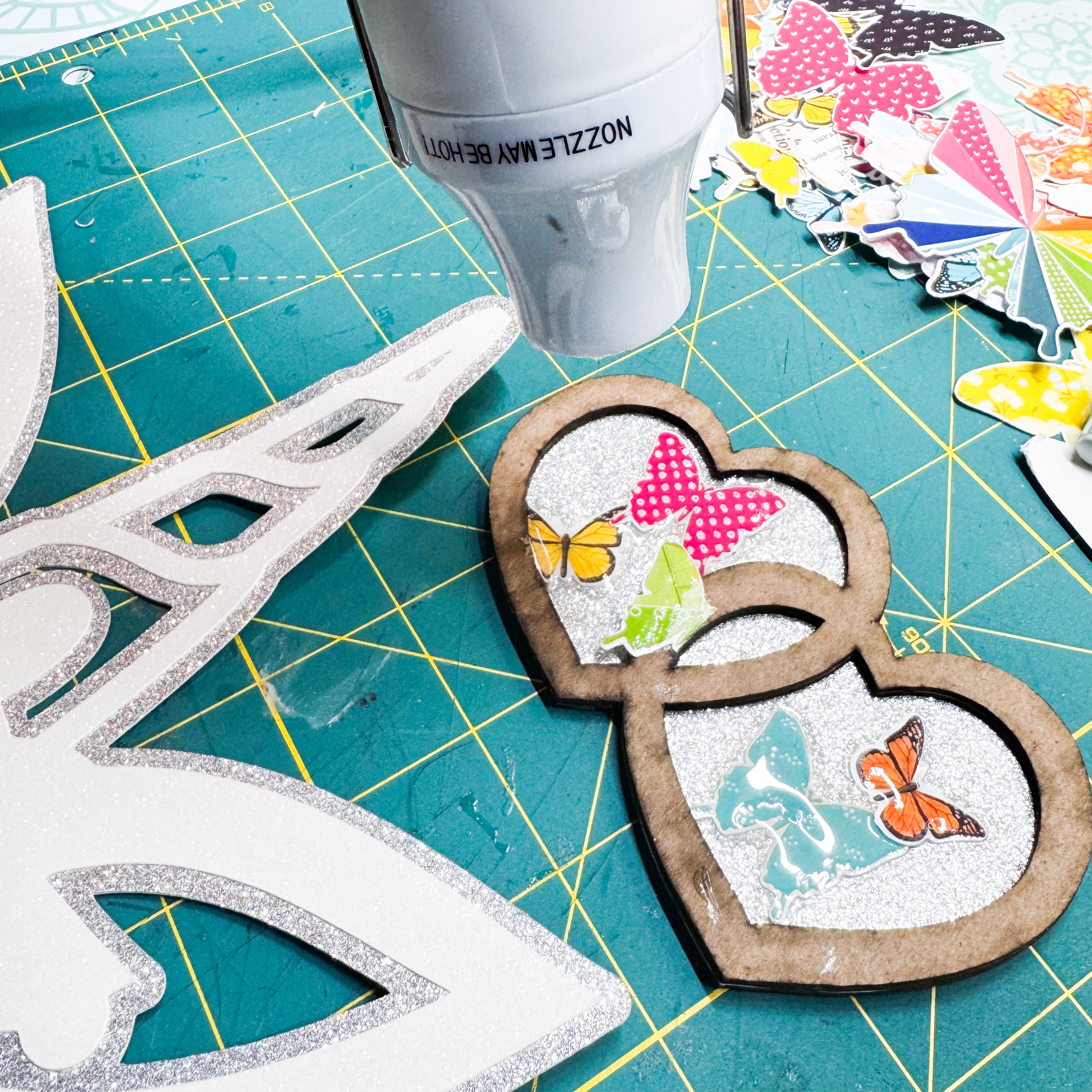 Before you add your filler, be sure to allow the glossy accents PLENTY of drying time. OR…cheat like I did and use a heat gun! HA HA! Otherwise, your shaker pieces will end up sticking to the butterflies, rather than "Shake~Shake~Shaking" inside the hearts.