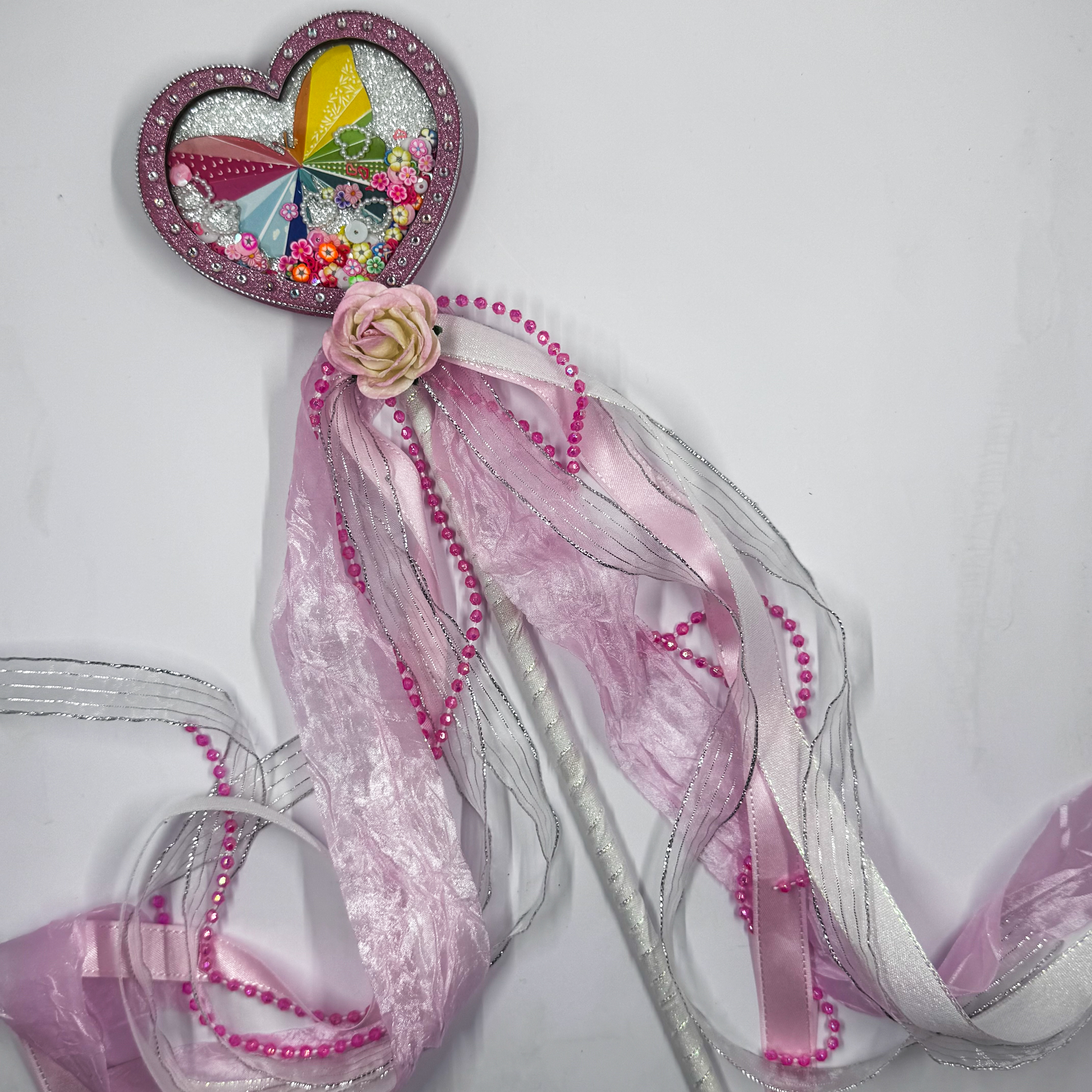 But wait…EVERY Princess has to have a wand, right??? Of course she does!! I used the single Mini Shaker Heart to make the wind! It was super simple! I just grabbed a dowel rod and wrapped in with ribbon and then glued the heart shaker to that. (I have these on hand as I used them frequently). Once the shaker was securely in place, I added a plethora of flows ribbons to the base of the heart, and topped it with a pretty pink rose from my stash. And again…VOILA!! The perfect Princess Shaker Wand!