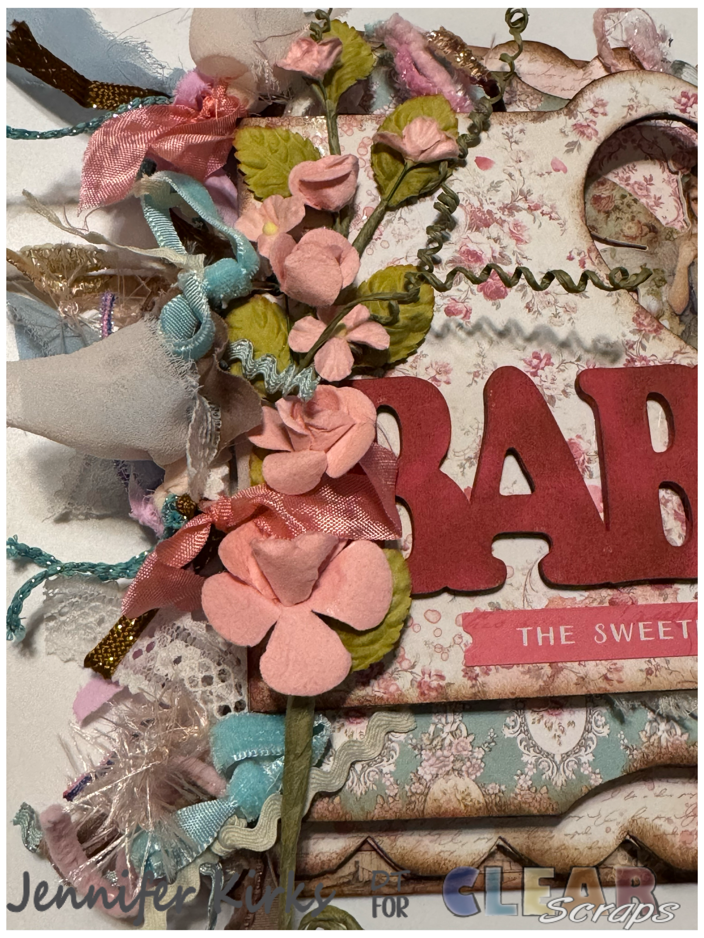 I added the "baby" wood shape to the front cover, along with some beautiful flowers to give it that perfect finishing touch. For a sweet surprise, I placed the rocking horse on the last page of the album, adding a little charm to the final spread. It really ties everything together beautifully!