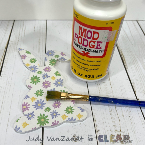 Adhere the patterned paper to the front of the bunny with Mod Podge. Apply Mod Podge to the top of the patterned paper to seal.