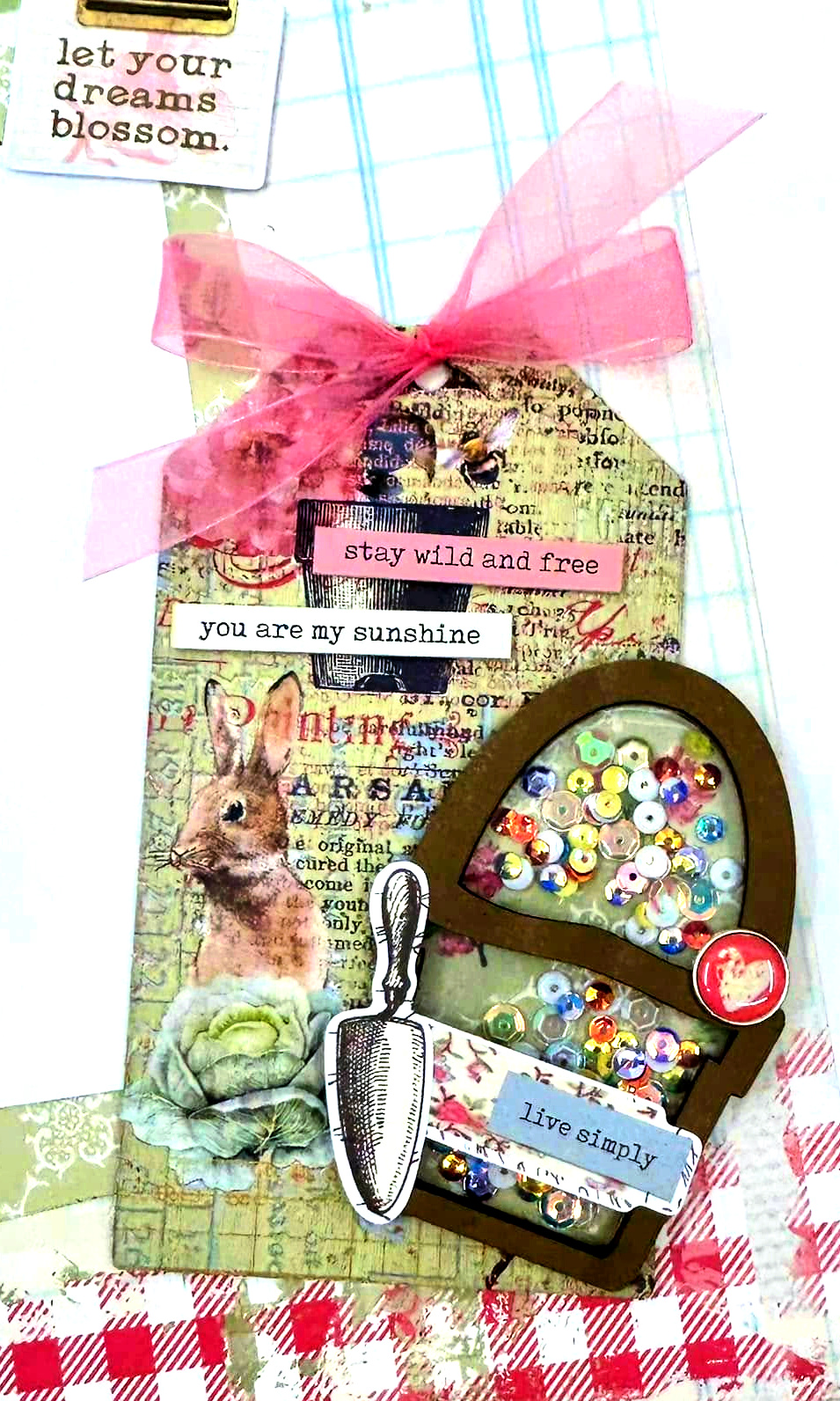I love the versatility of this tag. It's being used as a garden bucket in this LO, but it's easily a beach pail filled with sand or shells, an Easter basket, or even a purse! Your imagination is the only limit here! Paint, stencil, stamp, trace out and cover with paper, even use it in a mini album since you have the option to leave the pail clear (see through!).