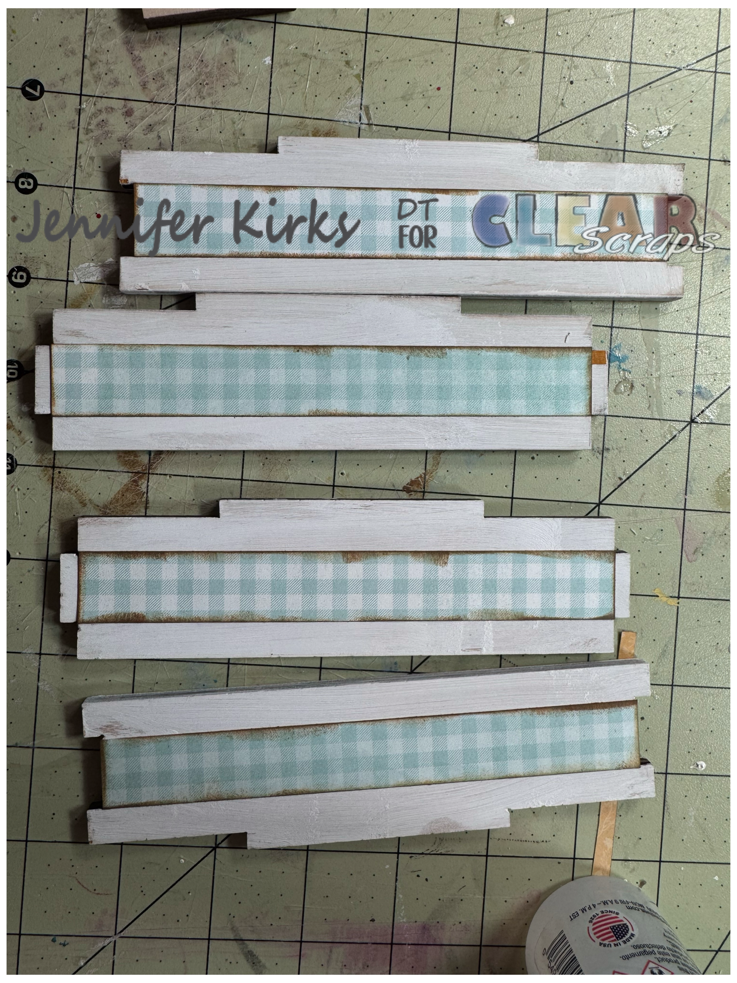 To start, I coated the sides and center pieces with a fresh layer of white chalk paint. While they dried, I got to work cutting ten 5.75x.75 strips of charming blue plaid paper. I then distressed the edges with a bit of brown ink for that perfect rustic touch. Once everything was prepped, I carefully glued each strip to the center of the wooden pieces, making sure to line them up perfectly. After that, I trimmed the tips and used an X-acto knife to delicately cut the middle section for a clean, sharp finish.