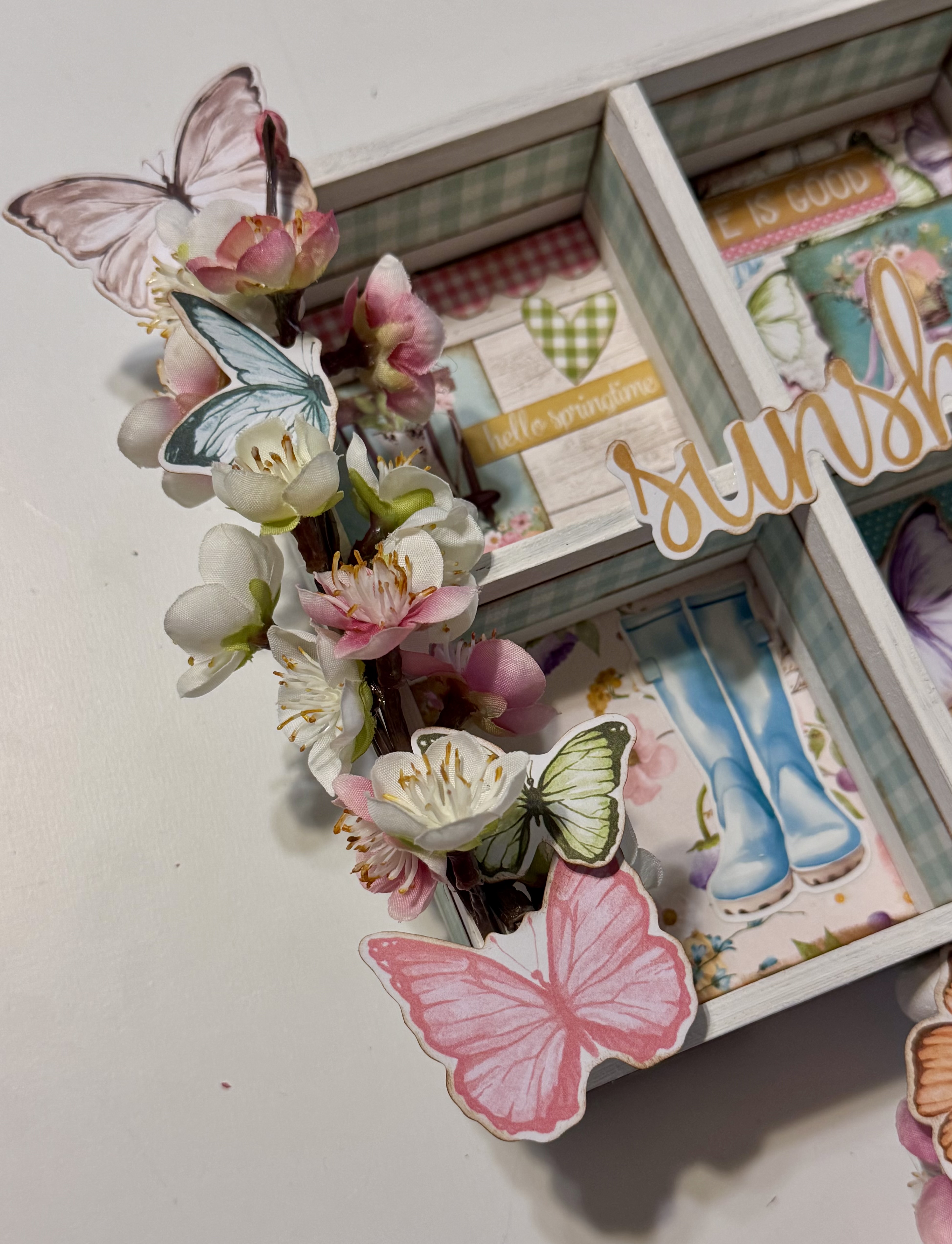 To bring the design to life, I gathered some delicate silk flowers and butterfly die cuts, layering them beautifully on the left side of the shadow box for that whimsical touch. Then, I turned my attention to the wood base, giving it a fresh coat of white chalk paint for a clean, crisp backdrop. To finish it off, I added more flowers and butterflies, creating a charming, layered effect that ties everything together.