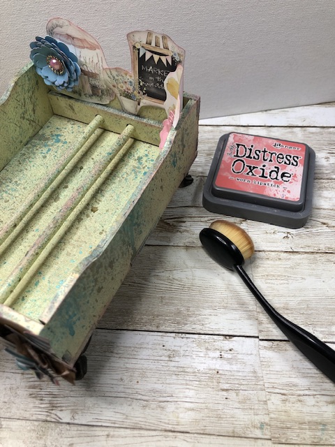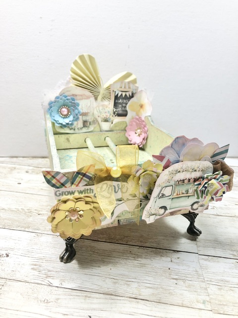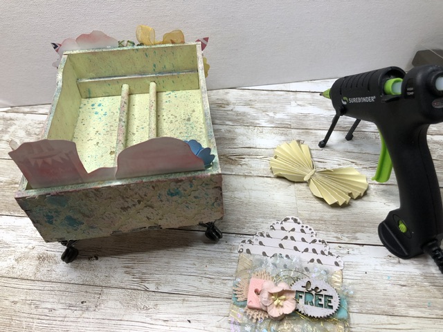 I used pink ink to continue the distressed look and added fussy cut images and flowers.