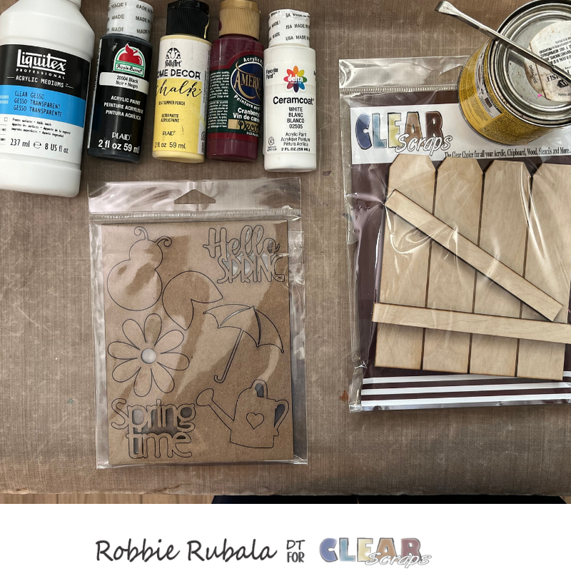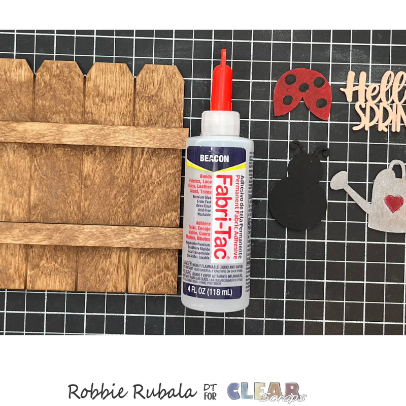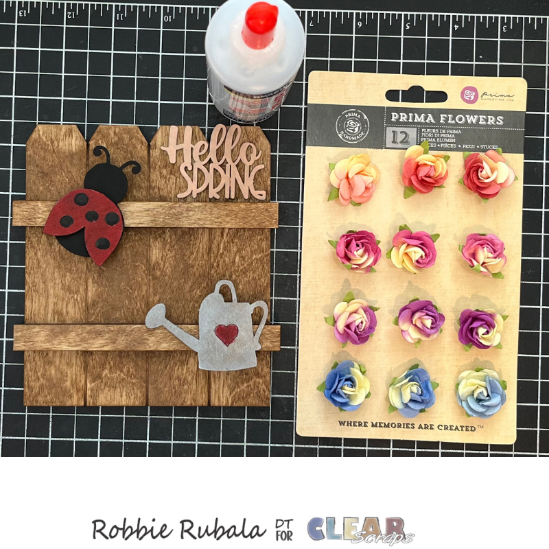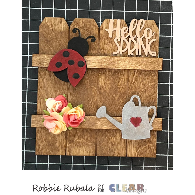 To create your fence you will need the following items. I used the Clear Scraps Fence Shiplap Shape – small and the Embellishments chipboard punch outs – Spring.