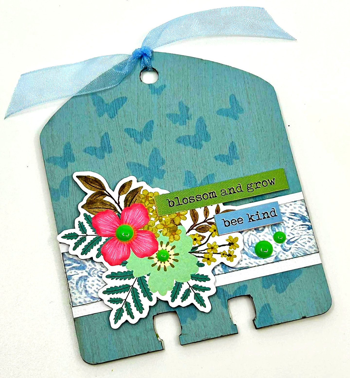 Other: Acrylic paint–green, blue, brown, distress ink-blue, Simple Stories Simple Vintage Spring Garden papers, ephemera, stickers, enamel dots, foam tape, glue.